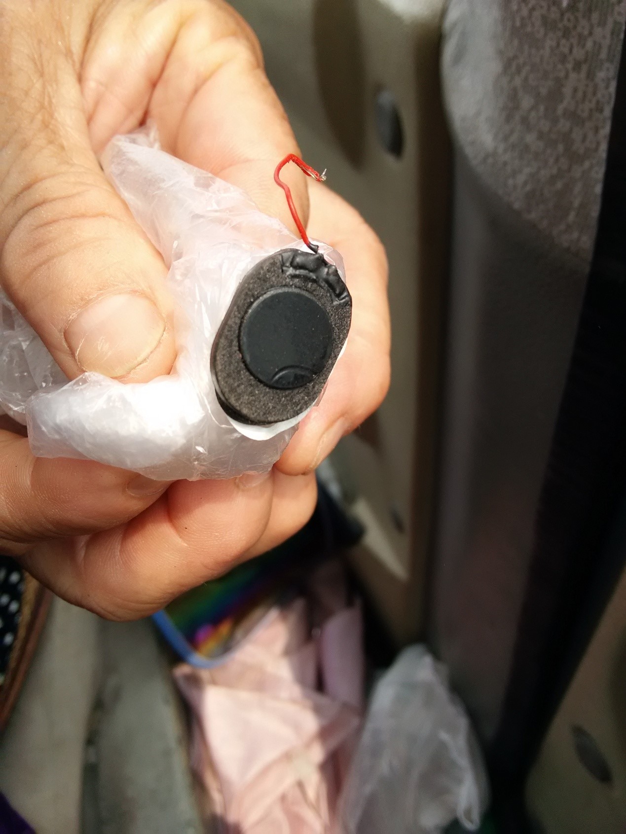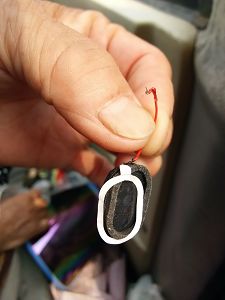 第二天,家人下班回来,听说警察進门骚扰一事,心里有些不安的说:他们来的目地仅仅是照相吗?没有其它目地吗?他们能不能做什么手脚?说着到处查找了一遍。果然不出所料,在桌子上一个不起眼放电池的小盒子里发现一个黑色的椭圆形的小东西,上面有一节电源线,侧面不干胶被揭开一个角(可能是因为时间仓促,没有找到隐蔽的地方粘,慌忙中放到盒子里)。(见下图)到网上一查,从各种形状的窃听器中,发现其中一枚和这个很相似。