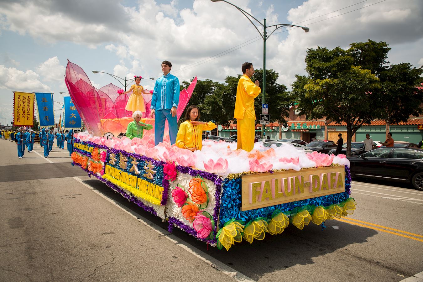 游行由“法轮大法”、“真善忍”锦旗开道,身着黄色炼功服的唐鼓队精神抖擞地紧随其后,手持莲花的仙女们身着五彩古装翩翩起舞,随后是大型莲花花车,法轮功学员在上面展示优美的功法动作。