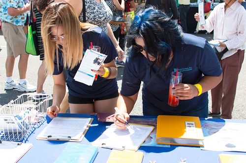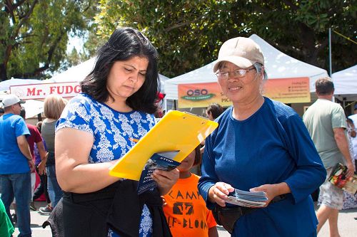 佛利蒙市艺术节是加州最大的免费街道节日,这两天的活动吸引了几十万人参加。法轮功学员星期六一大早就在主办方免费提供的自由言论区布置好展位,向人们讲述法轮功真相,曝光中共活摘法轮功学员器官的暴行。