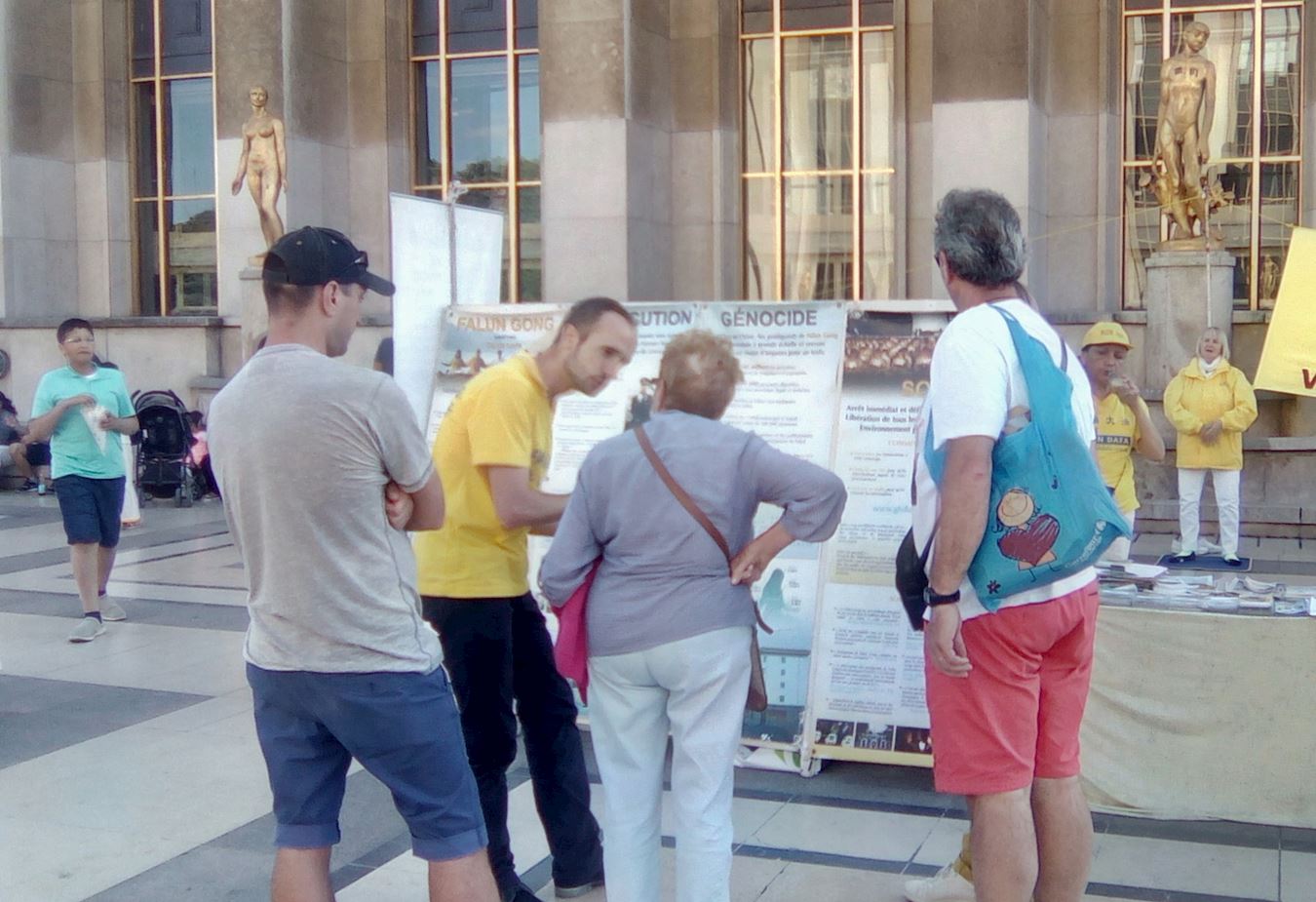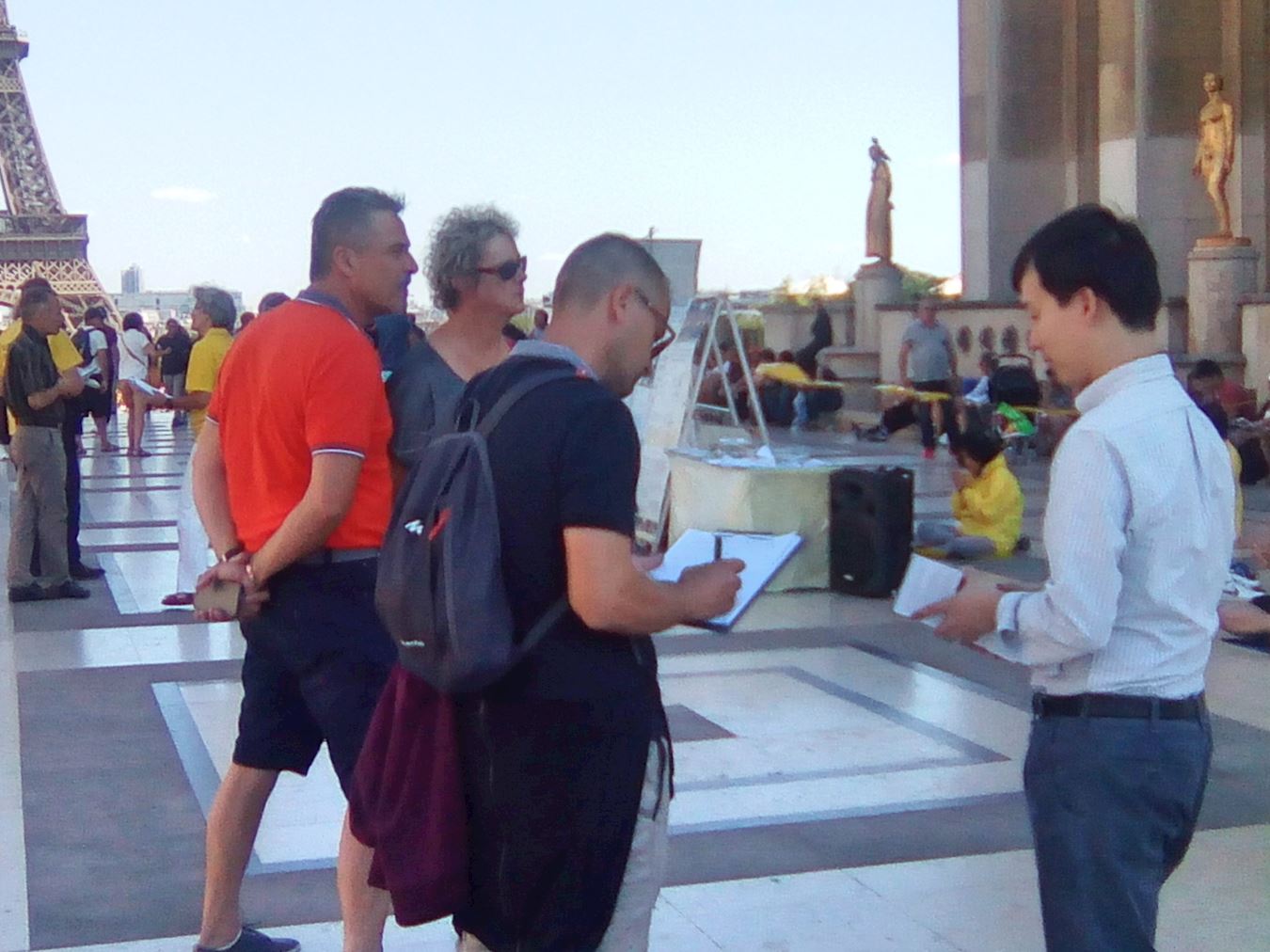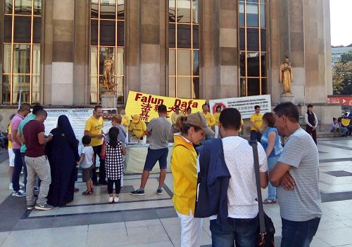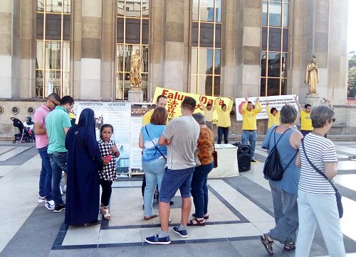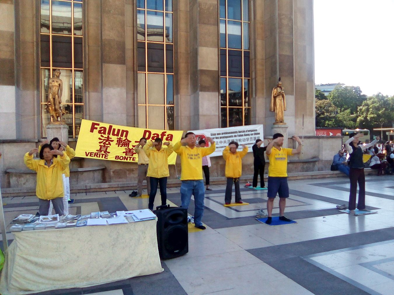 ![]() 图1:二零一七年八月六日下午,法国部份法轮功学员再次来到艾菲尔铁塔边的人权广场,进行了法轮功功法表演、讲真相的活动。 |