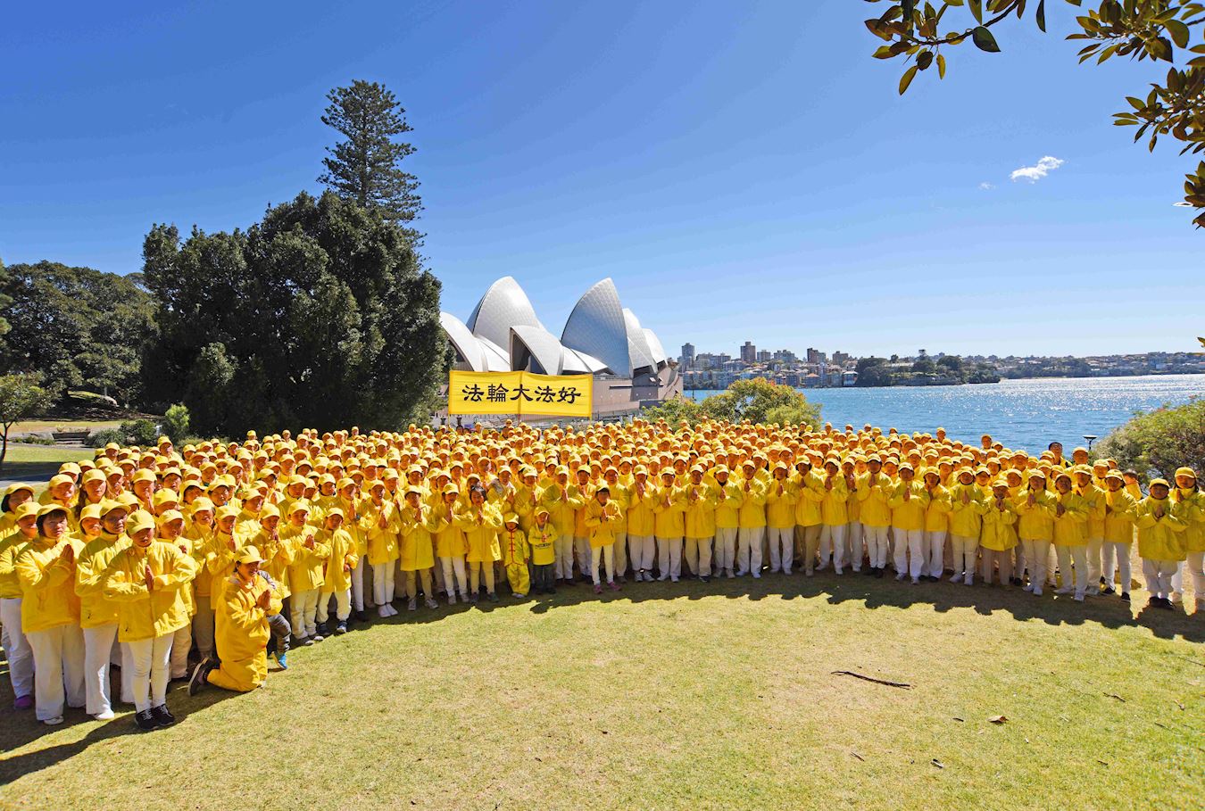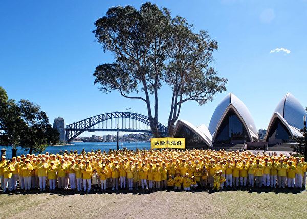 排字结束后,在场的法轮功学员们在皇家植物园的另一侧,以悉尼大桥和悉尼歌剧院为背景,集体合影。每个人带着由衷的微笑高声说:“法轮大法好!”“真善忍好!”“谢谢师尊!”