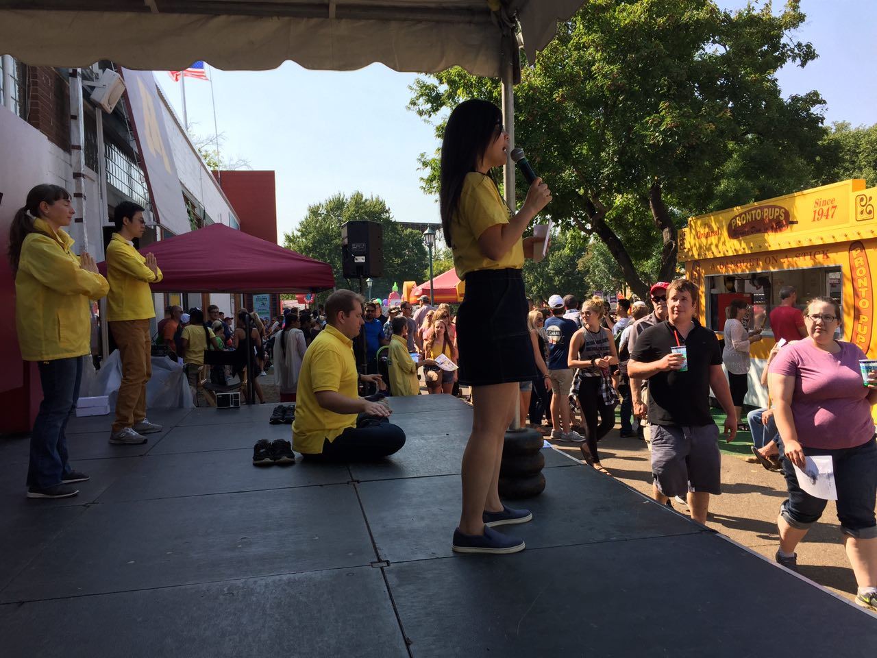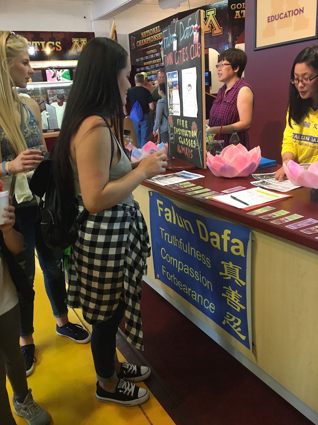 每一天,当地的法轮功学员向来往的人群介绍法轮功(又称法轮大法)是什么,为什么要修真善忍,以及中国共产党对法轮功学员的残酷迫害,包括活体摘取法轮功学员器官的真相。美国明尼苏达大学双城分校的法轮功学生俱乐部(Falun Gong Twin Cities Club)也再次在集市最繁忙的几天里安排了展位及功法演示,展现法轮大法的美好。