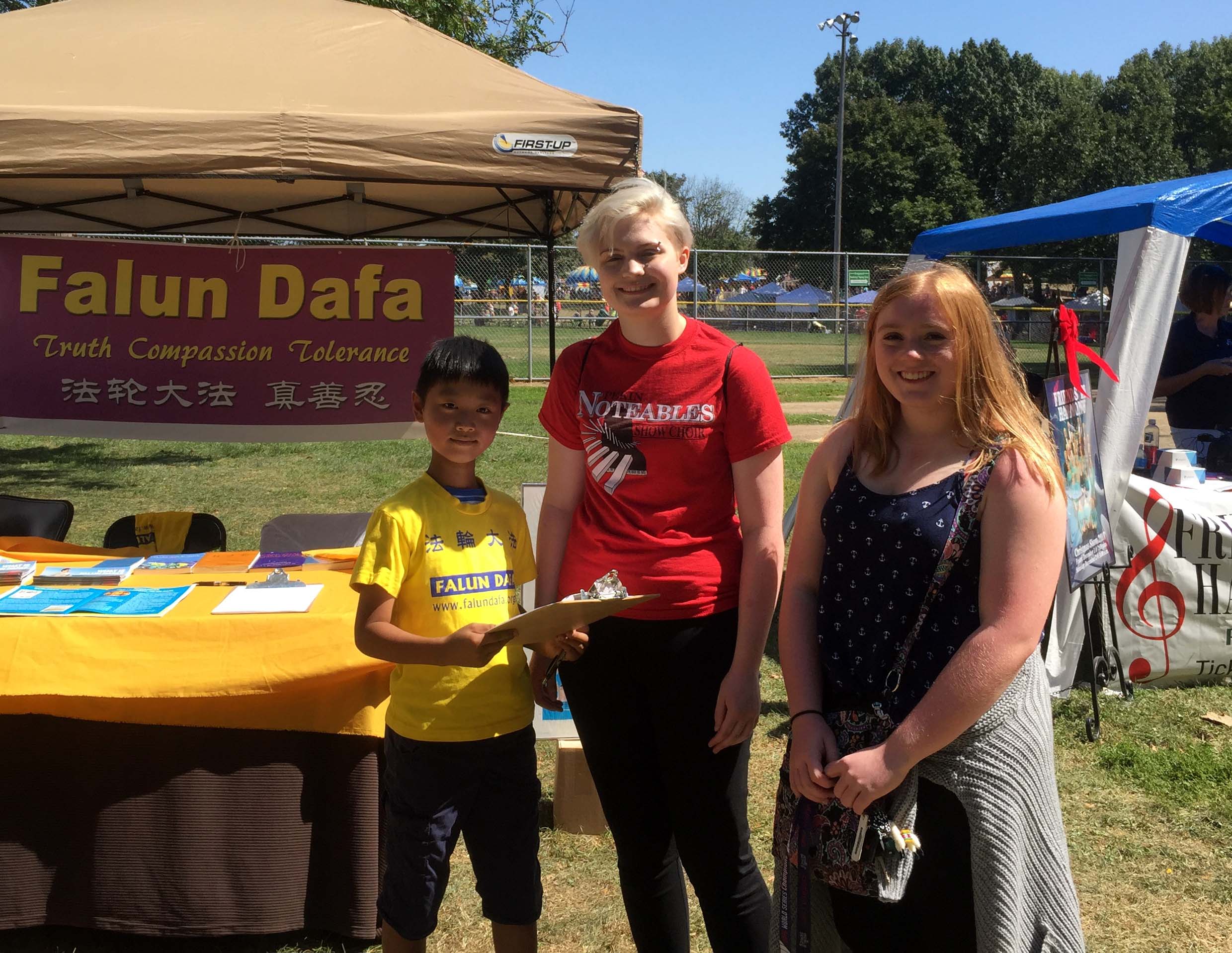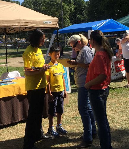 法轮功学员展位的右边一个当地高中的基督教会组织。有一位年长的先生见到法轮功学员们时,热情地打招呼。他说,他了解法轮功及发生在中国的迫害,从其它社交媒体上他知道法轮功学员器官被中共活摘的情况。他率先在谴责中共活摘器官的征签表上签了名。