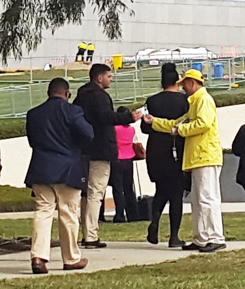 ![]() 图5:法轮功学员在堪培拉国会大厦前发法轮功真相资料给前往国会大厦的工作人员 |