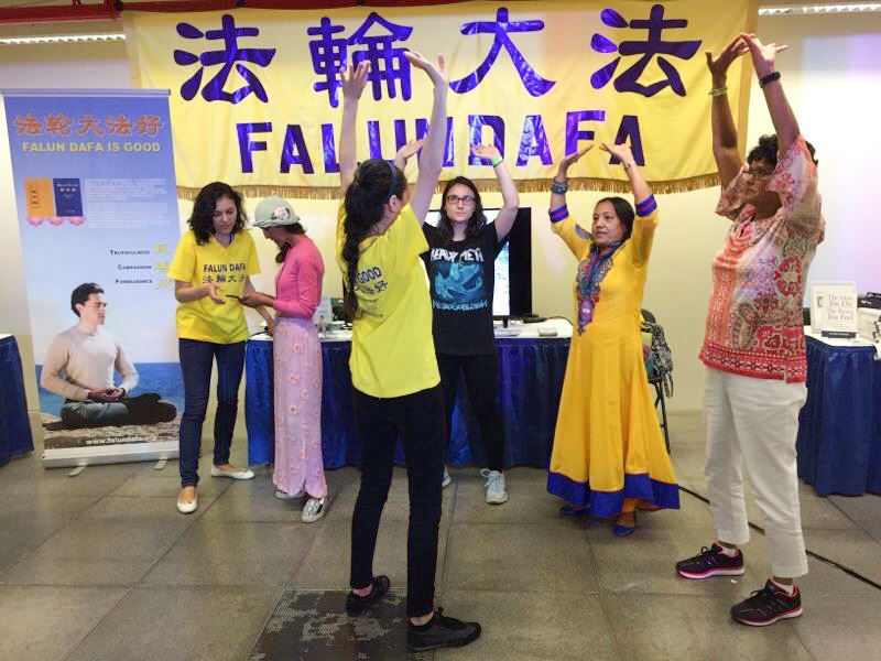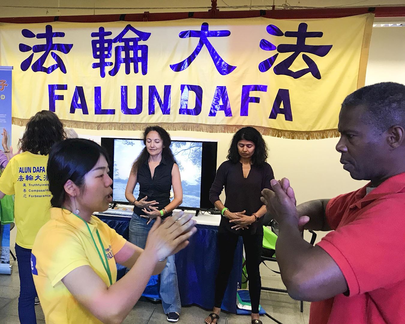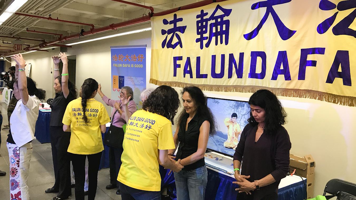 一位男士告诉学员他以前就听说过法轮功,并一直好奇想尝试学炼都没有成功,今天他特别高兴终于能够学炼法轮功功法了。这时旁边一位客人问学员纽约市哪里可以学功,在学员回答问题之前,这位男士已经告诉这位客人哪里他可以学功甚至学员们在那炼功的时间。