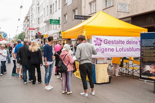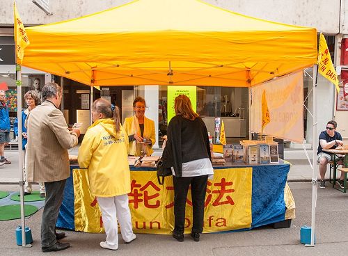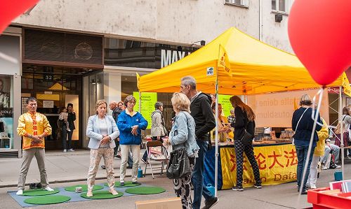 在参加活动团体中,一位奥地利年轻人,看到法轮功学员祥和的功法表演,非常感兴趣,并想学炼功法。学员详细的向其介绍了法轮功性命双修的特点。并告诉他维也纳炼功点的详细情况。
