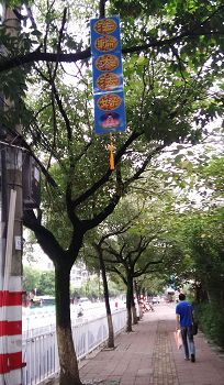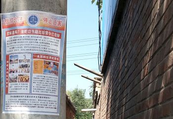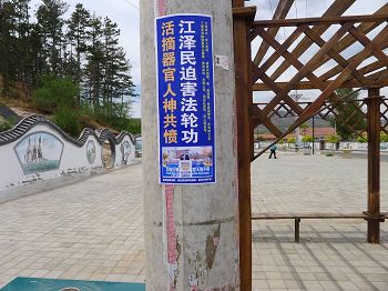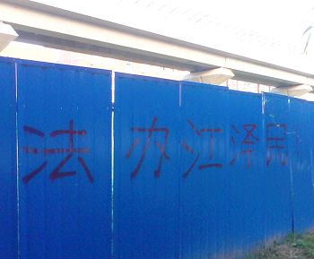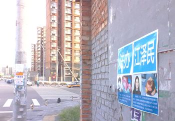青岛某地一条街道旁的一个电线杆子上贴着一个“全国起诉江泽民”的不干胶条幅,旁边有人写了三个大字“我同意”,表达了百姓的心声。