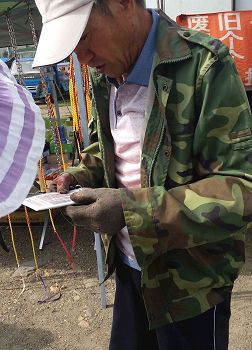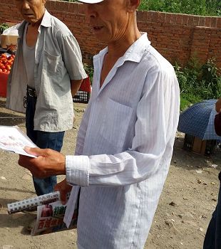 长春某镇大集市法轮功学员,面对面讲真相、发真相资料,世人接到真相资料后,喜笑颜开的场面。
