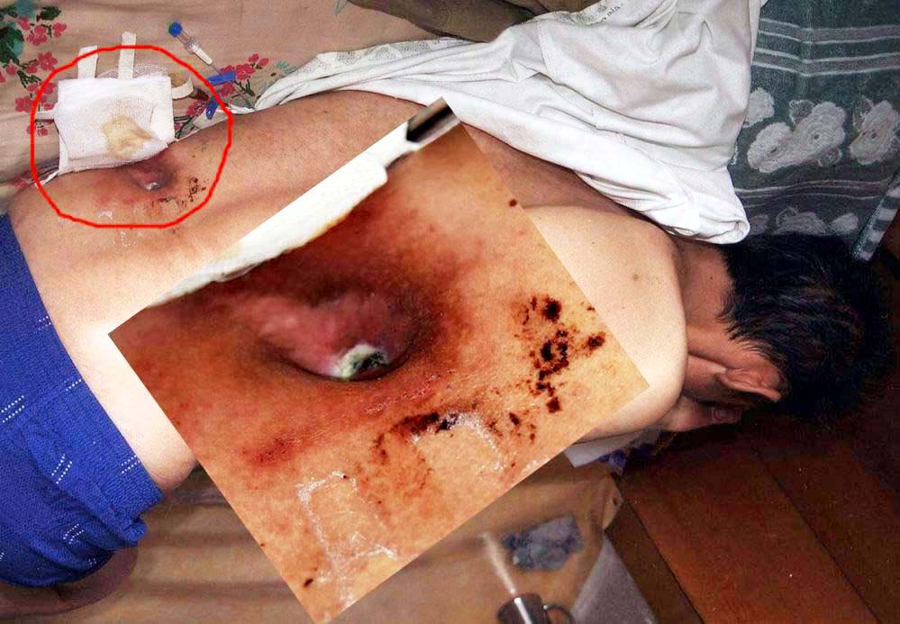 被长期酷刑折磨,致使身上伤痕累累,头部有直径约三厘米的圆形塌陷,左侧外耳撕裂,经常出血,鼻骨骨折,后背等处有多处疤痕,门牙掉两颗,声带已因灌食等严重损坏,说话声音嘶哑、微弱,已无法大声喊出“法轮大法好”。