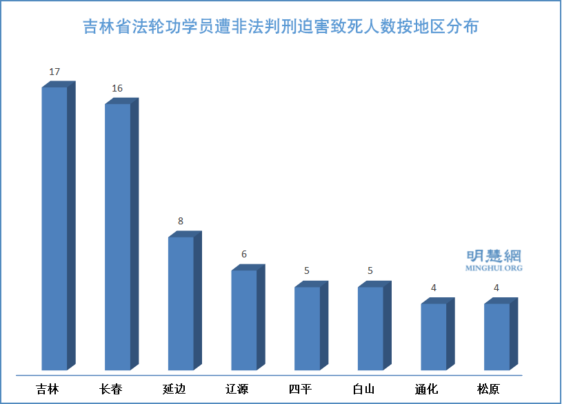 四平地区被非法判刑迫害致死的法轮功学员5人;白山地区被非法判刑迫害致死的法轮功学员5人;辽源地区被非法判刑迫害致死的法轮功学员6人;延边地区被非法判刑迫害致死的法轮功学员8人。