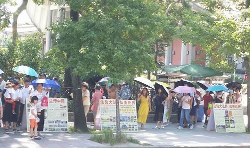 另一位已在台湾环岛十天自由行的中年人,他说一路观察在台湾保存了中华传统文化,感慨在中国大陆人们上寺庙的心已经不敬,只想从神明索取个人的利益好处,所以正在找其他西方宗教的书籍以求得信仰的依归。学员向他说明法轮大法的修炼、即便在中共灭绝式的对待下,国内的大法学员仍能坚定信仰、无怨无悔地走过了风雨飘摇的十八年,不正以说明“法轮大法”之伟大?他沉思了一会也请了一本《转法轮》回去研读。