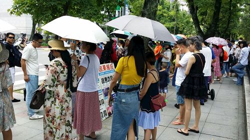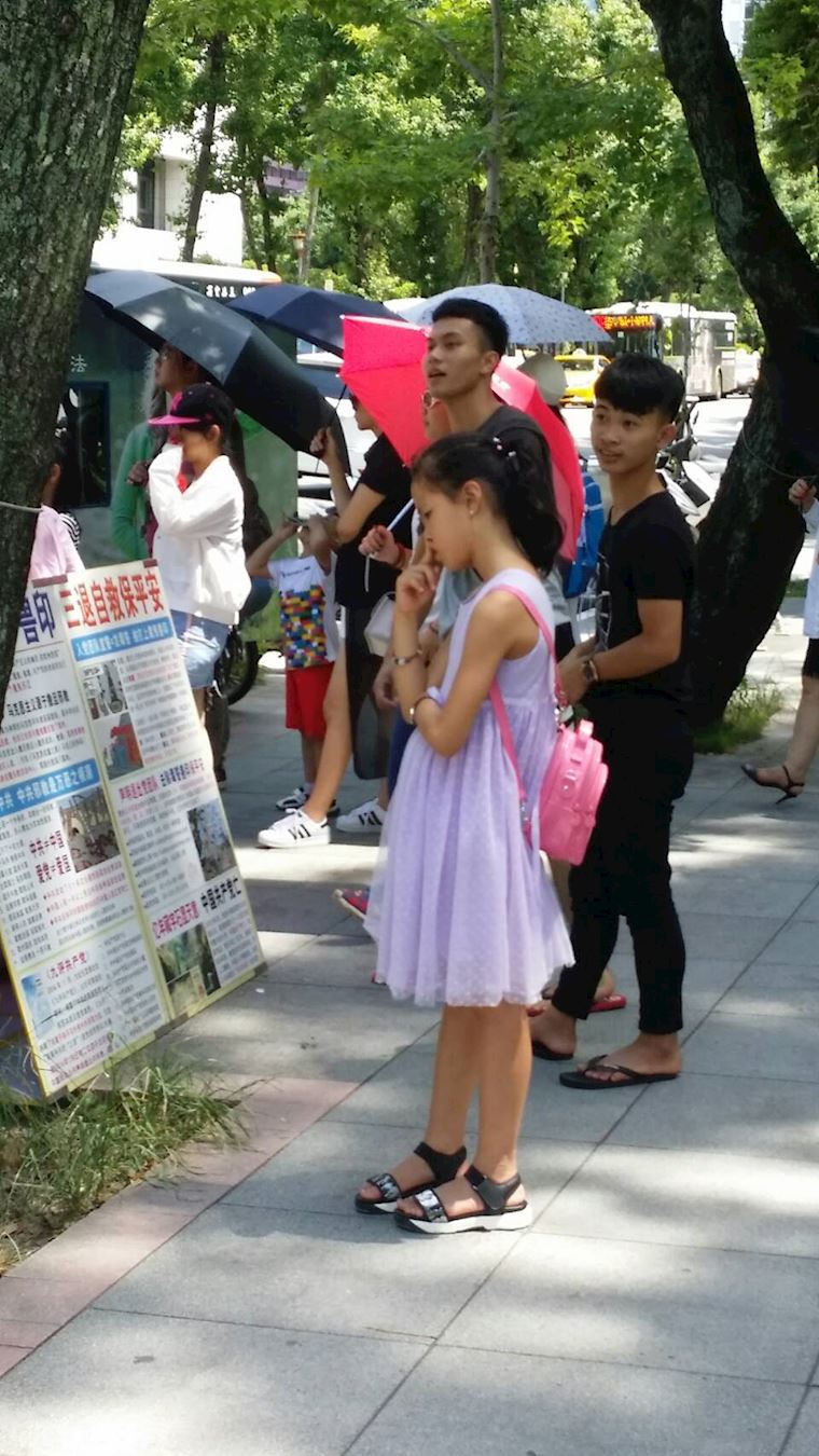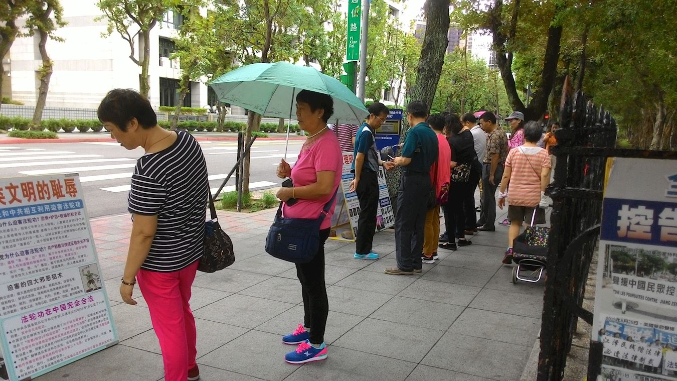 过不久另一位台湾导游带来了整团游客,大声宣布并交待团员:“我们马上要去看交接典礼,看完我们就在法轮功这里集合,就在这里喔,好,那现在你们如果要三:退.的呢,来找我!”学员向这位导游致意,并感谢他协助中国游客在台湾之旅了解真相。
