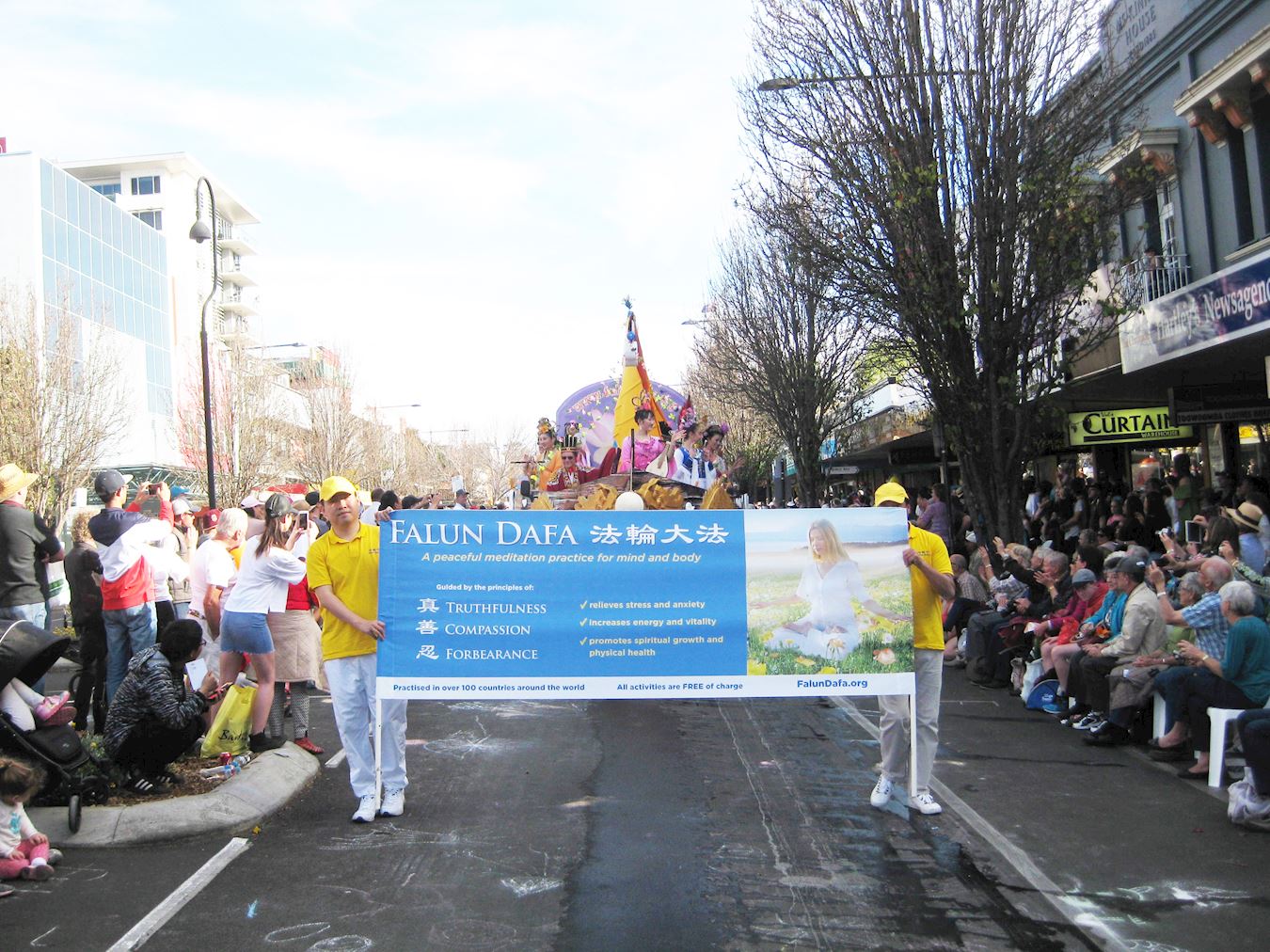 由悉尼和墨尔本法轮功学员组成的天国乐团再次应邀参加了本届花节大游行。他们阵容整齐,服饰亮丽,沿途为数万观众演奏了数首雄壮悦耳的乐曲,包括《法轮大法好》、《法正乾坤》、《法轮圣王》、《欢乐颂》、《送宝》等,赢得观众阵阵掌声和喝彩。