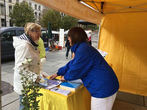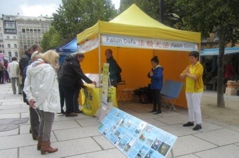 有一位西方白人男士走过来,对一个法轮功学员说:“我已经两次去中国旅行了,但是法轮功并不被中国政府所接受,你能解释一下为什么这样吗?”学员向他讲述了中共无神论及其极权、暴政统治对中国人的迫害,并且介绍了中共一手制造的“天安门自焚”伪案对法轮功的造谣、污蔑和诽谤的运动。这项长达十八年的打压仍然持续至今,并且仍然继续着。法轮功以“真、善、忍”为最高法理,提升人们的自我约束能力和道德修养水平,促进了身体健康。
