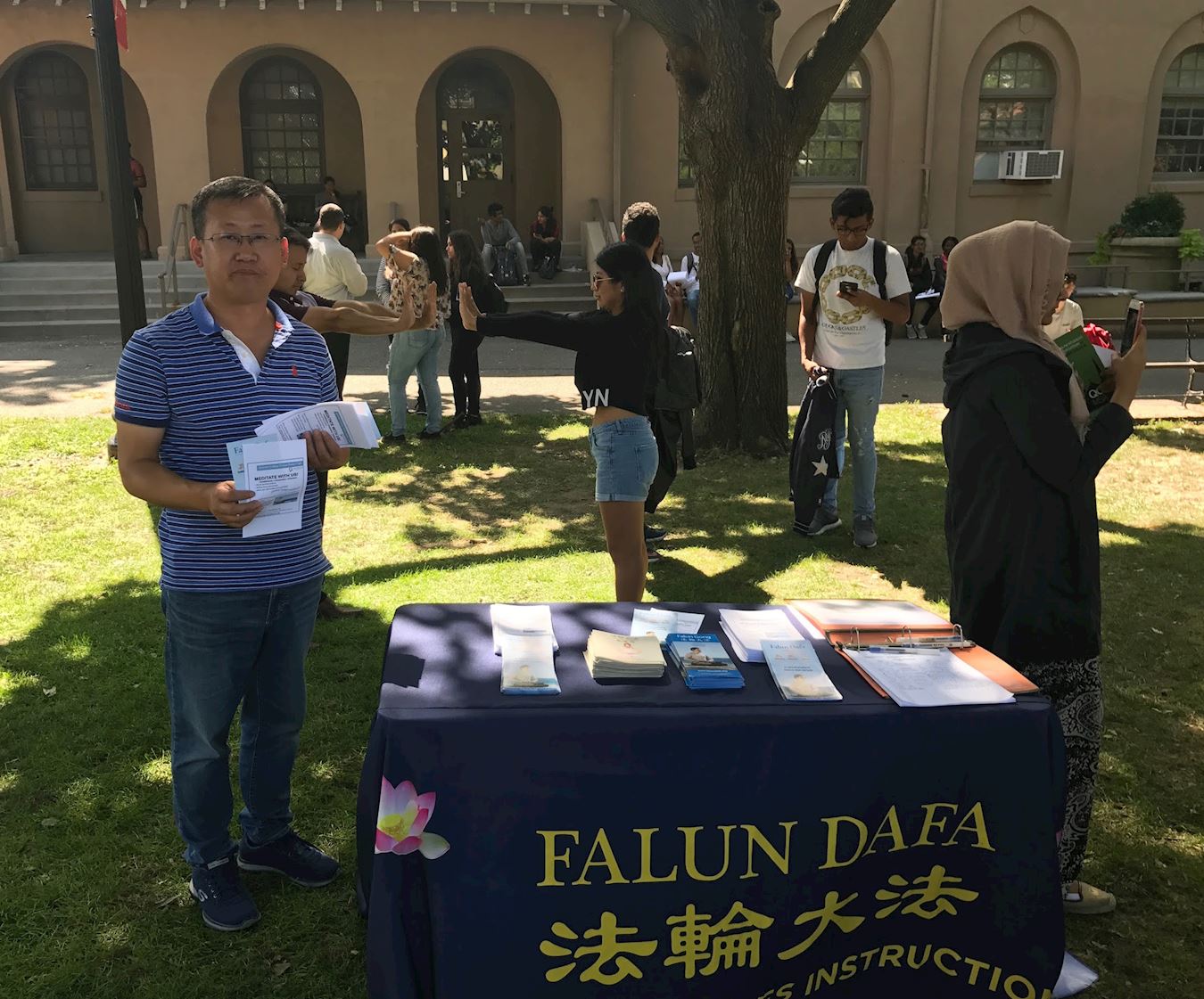 二零一七年九月十三日, 纽约市立大学皇后大学(CUNY - Queens College) 在校园中央草坪上举办了秋季社团展,法轮大法社团跟同校师生们分享这个缓解压力舒缓身心的功法,他们亲身经历,通过修炼法轮大法,学会用真、善、忍为准则待人接物,处处为他人考虑,提高心性的同时炼五套缓、慢、圆的功法,非常有效的缓解精神压力和腰酸背痛,在学习中,头脑更加条理清晰,提高学习效率。