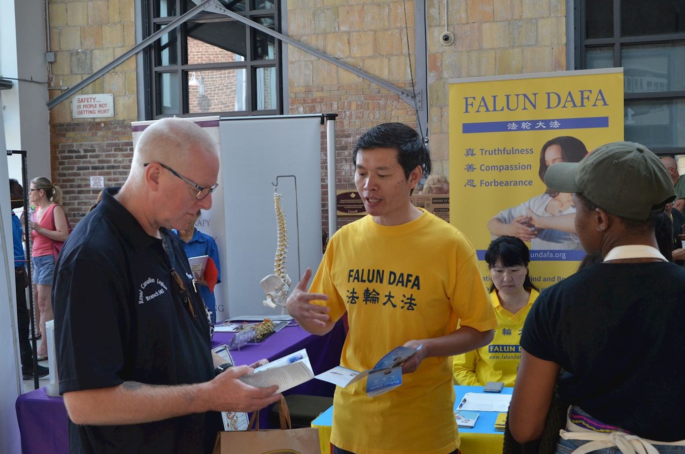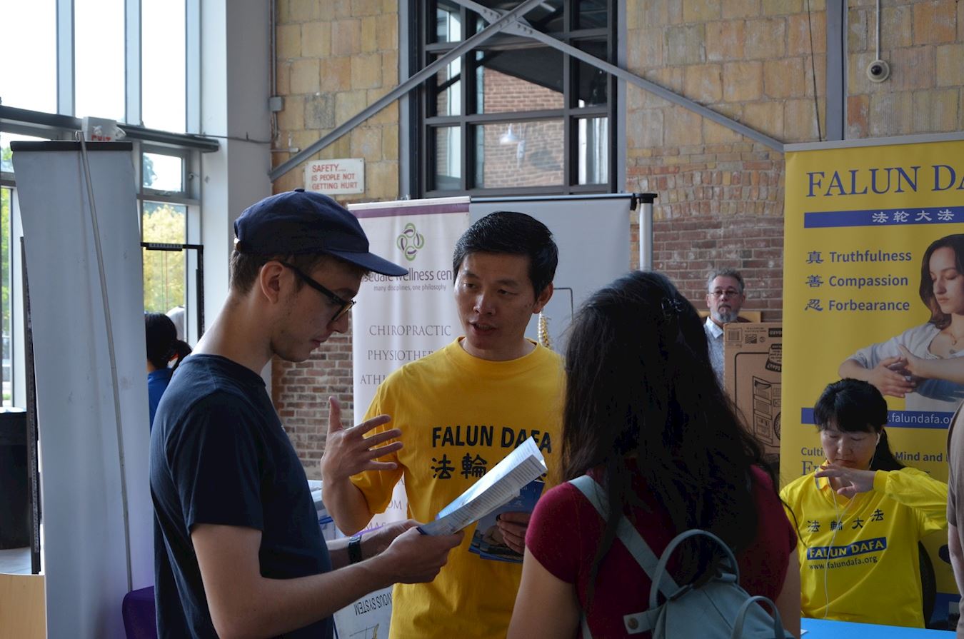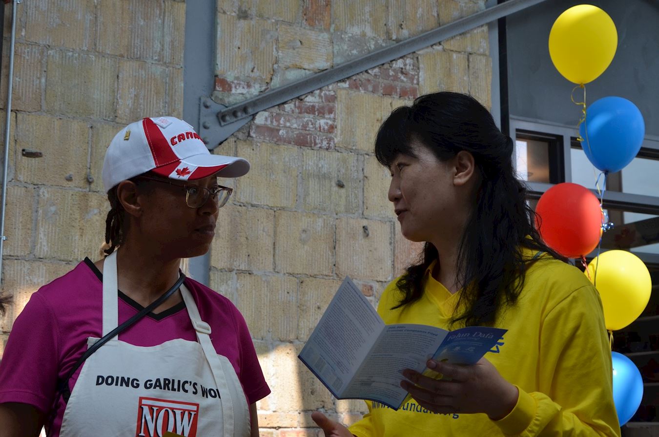 马琳(Marlene)女士在法轮功的展位前停下来仔细阅读介绍法轮功的资料,她告诉学员她是位退休教师,几年前曾经读过法轮功的主要著作《转法轮》,但由于工作忙碌就错过了,她表示今天见到学员很是高兴,她也谢谢学员把法轮功又带到了她的身边。
