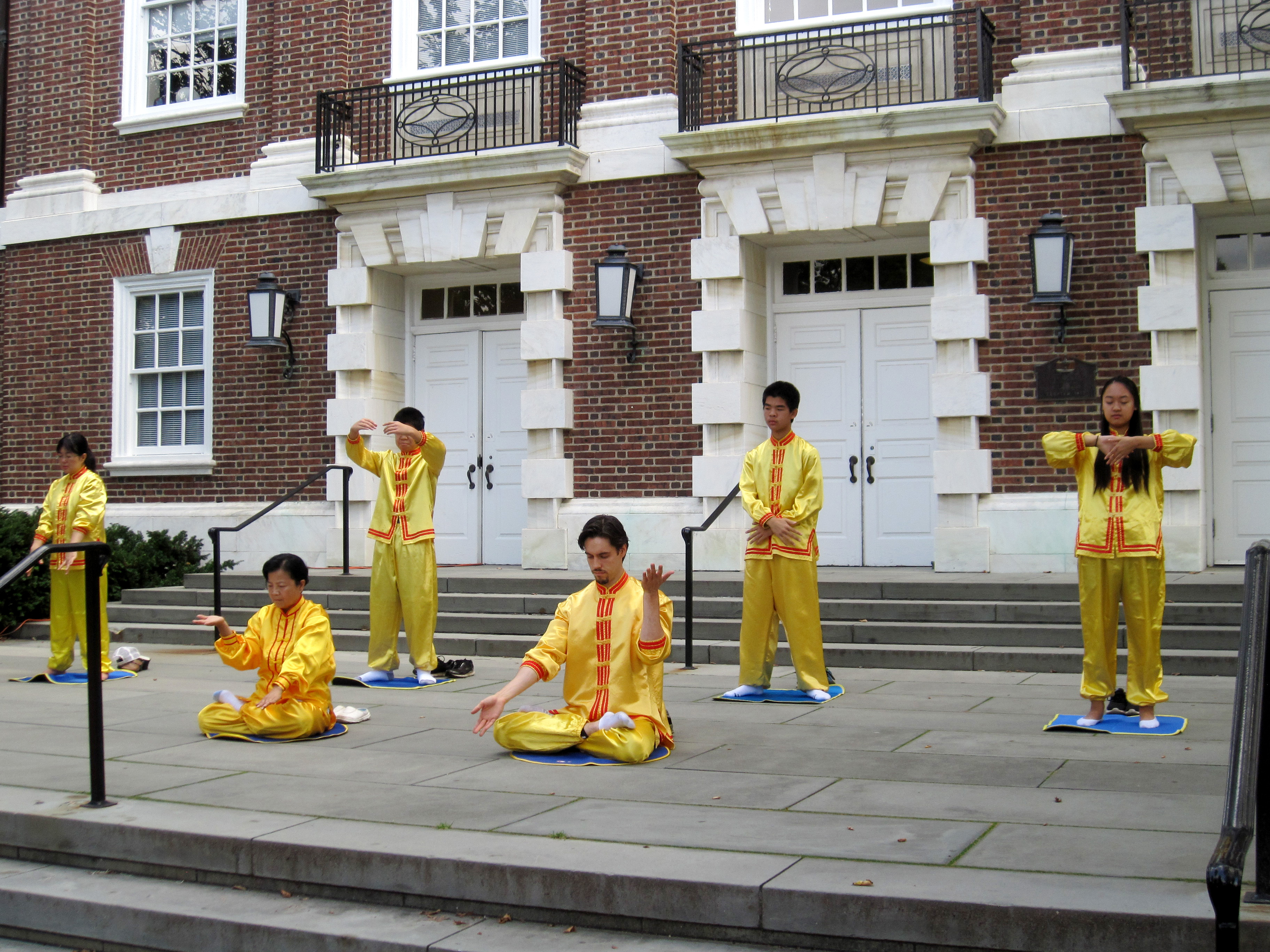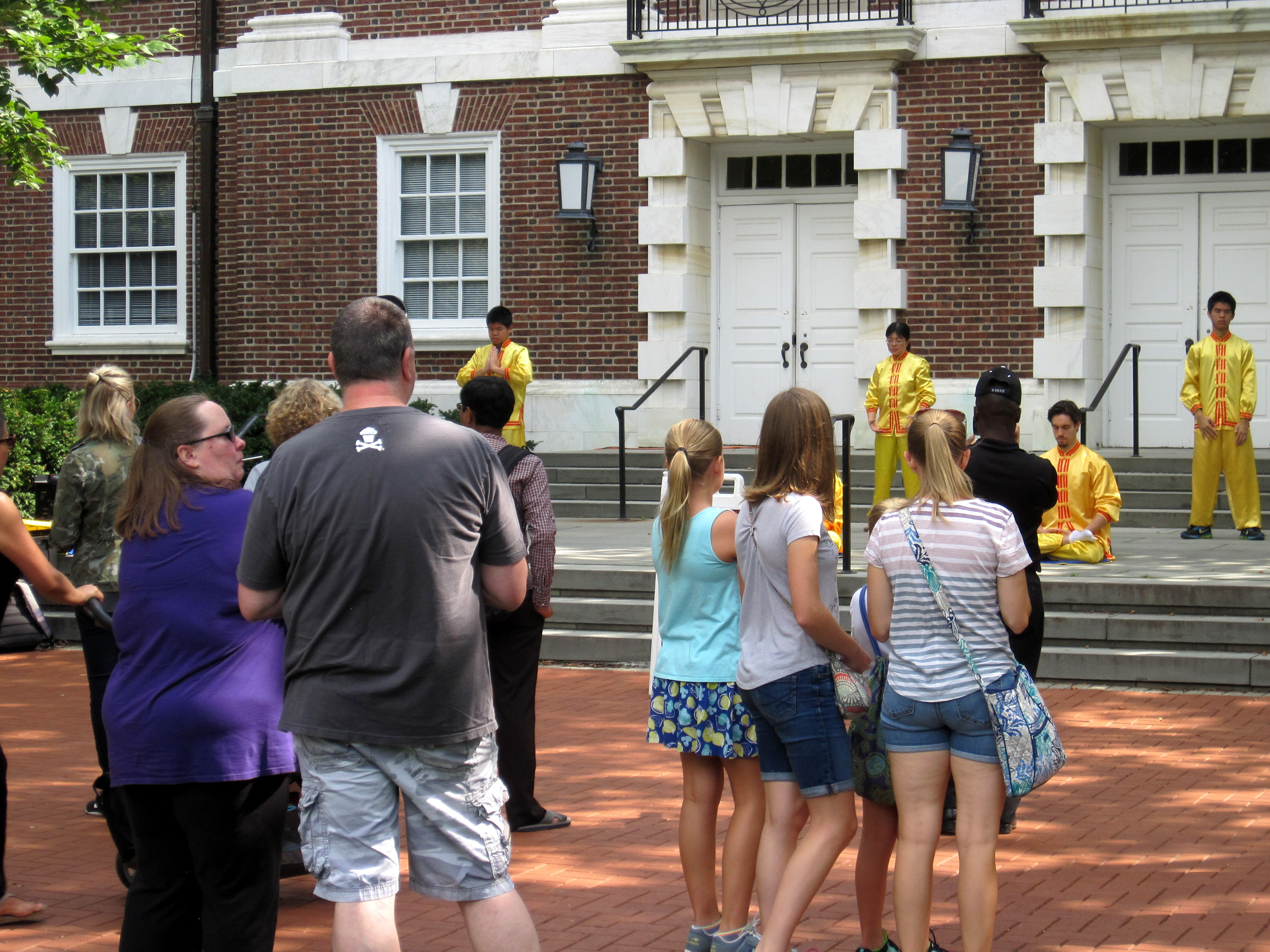 今年的社区日有超过二百八十个团体和商家参展,除真相展位外,法轮功学员应邀在Wolf Hall教学楼前做功法演示,由四位学员同时做四套动功功法演示、两位学员做静功打坐功法演示,舒缓的炼功动作和令人心境平和的悦耳炼功音乐吸引了很多人驻足观看,并纷纷接取功法介绍的传单以详细了解。功法演示结束后,观众们报以热烈的掌声,感谢法轮功学员给社区带来使身心健康的东方传统修炼方法。