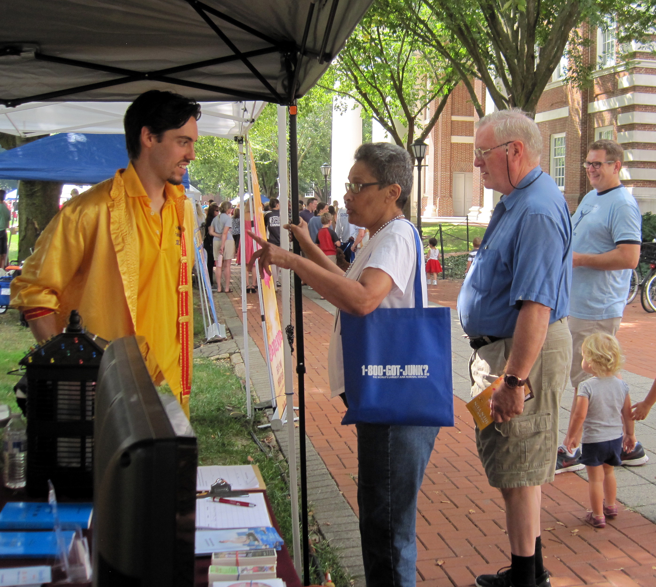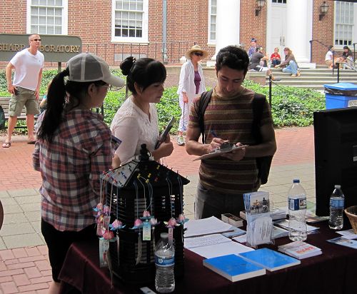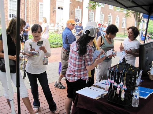 法轮功展位前游客络绎不绝。许多游客接过功法介绍传单后很感兴趣,有的游客被展位上播放的法轮功教功录像吸引,纷纷停下来观看,希望能进一步了解。不少当地社区居民咨询在哪里可以学炼这种功法,当听说每周三在德拉华大学都有法轮功学员义务教炼功法时,很多人都高兴地表示想能参加,并索要了教功时间和地址等信息。不少德拉华大学的学生对这种传统的东方修炼方法也很感兴趣,尤其是看到功法能减缓压力,令身心得到同步和谐的介绍后,纷纷表示想学炼。