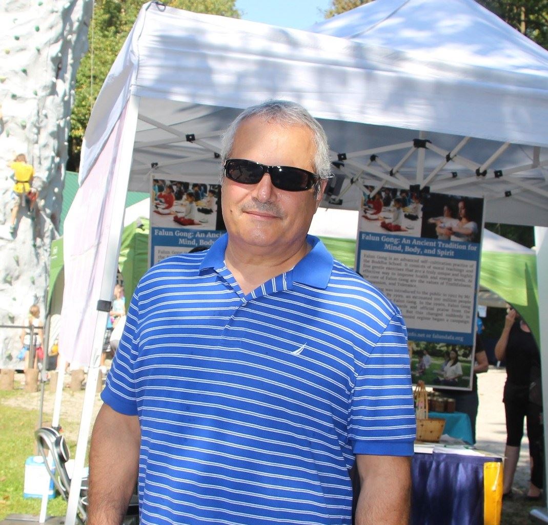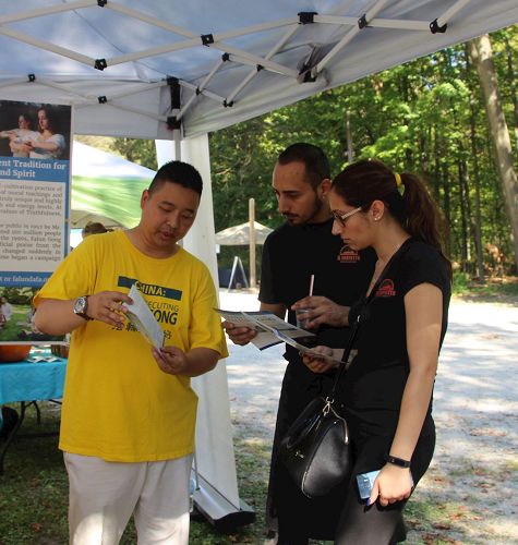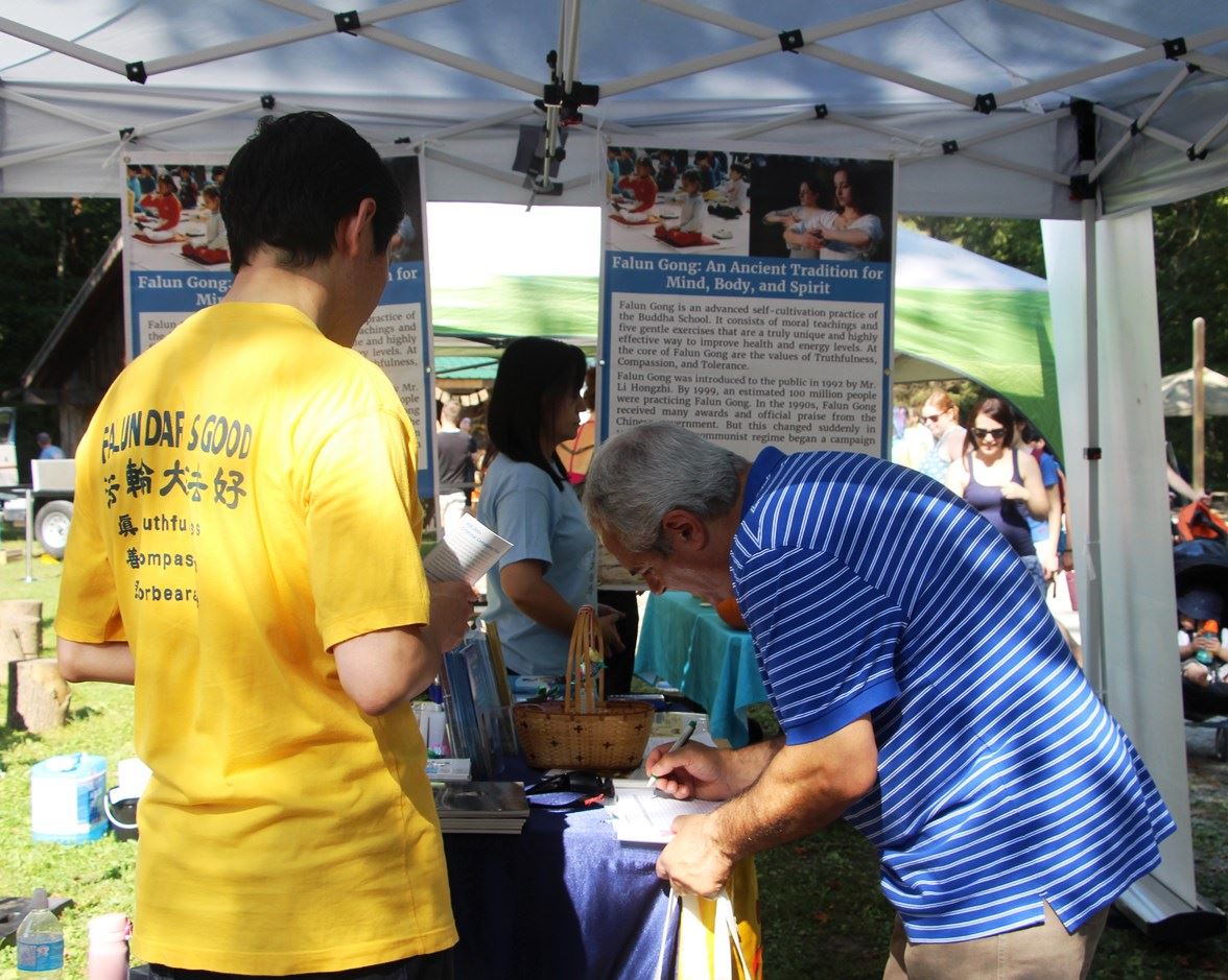 奥罗拉居民Frank和妻子经过法轮功学员的摊位时被功法演示吸引了,他很认真地听了介绍,非常感兴趣。得知法轮功学员会定期举办免费教功“九天班”,他马上就在登记表上写上了他的联系方式。他说:“当我知道这个功法是有益于身心健康时,我非常想学。为了能学更多,我就登记了要参加九天班。非常感谢法轮功学员告诉我这个信息。”