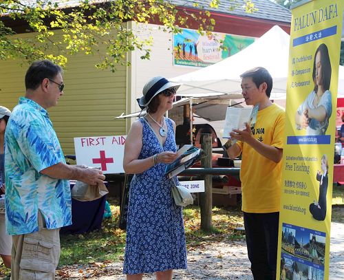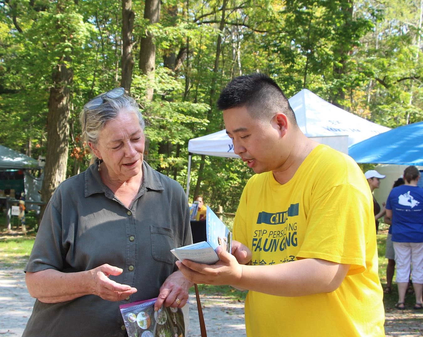 奥罗拉居民Jacky来到法轮功学员的摊位,听了介绍后,她拿着传单说:“太谢谢了,今天让我知道了这个这么美好的功法,还知道了这个团体在中国的受迫害情况。我是第一次听说,我回去一定好好看看和了解。非常感谢!”