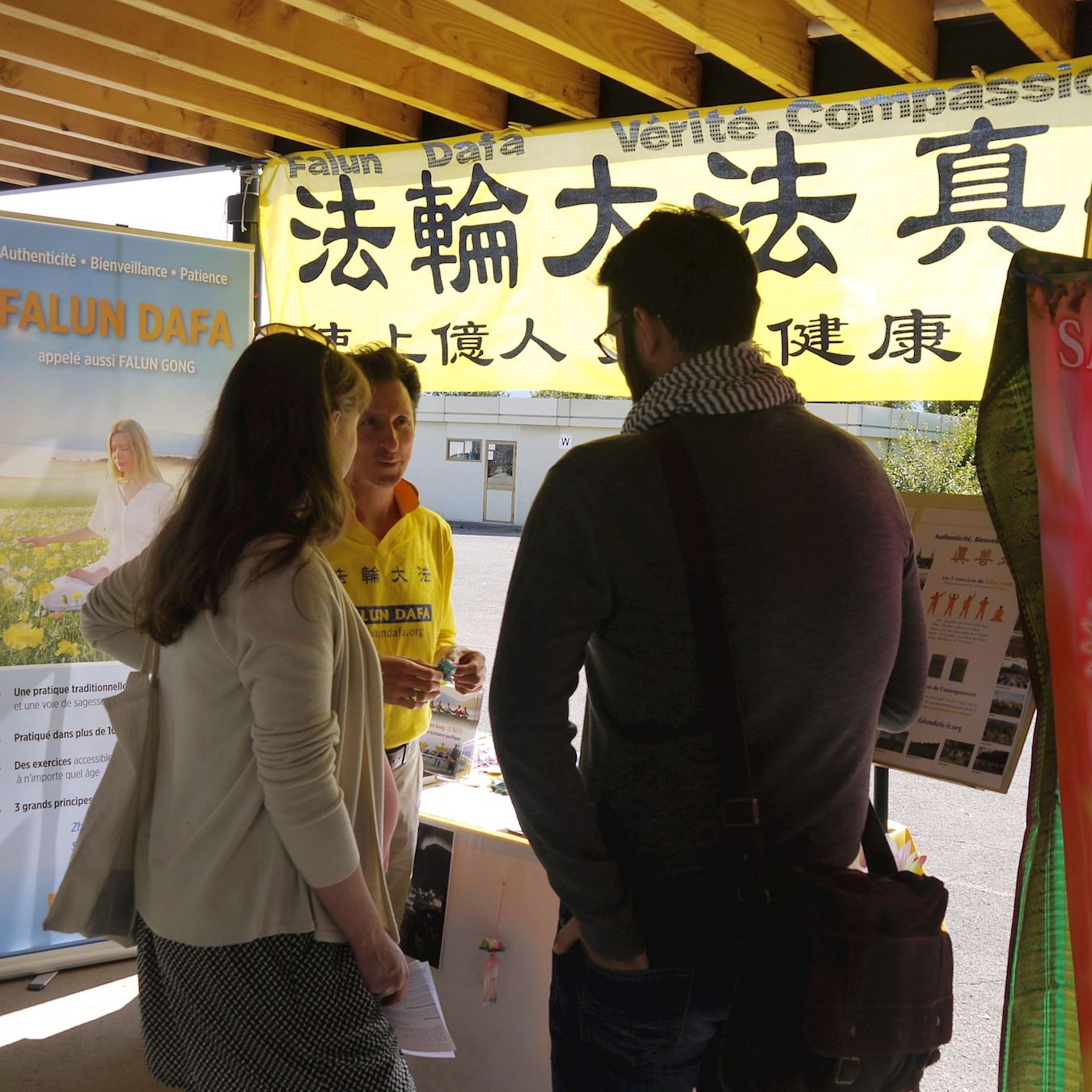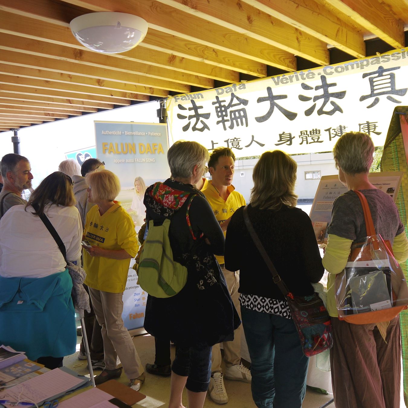 前来看展览会的人,大多都没有听说过法轮功。经过法轮功展位时,都表现出极大的兴趣。他们倾听法轮功学员的解说,“法轮功修炼真、善、忍,共有包括打坐的五套功法,还有《转法轮》指导在日常生活中的修炼。”当他们知道在中国法轮功学员遭受的迫害时,很受触动,很多人都在反迫害征签表上签字,都想要帮助法轮功学员。