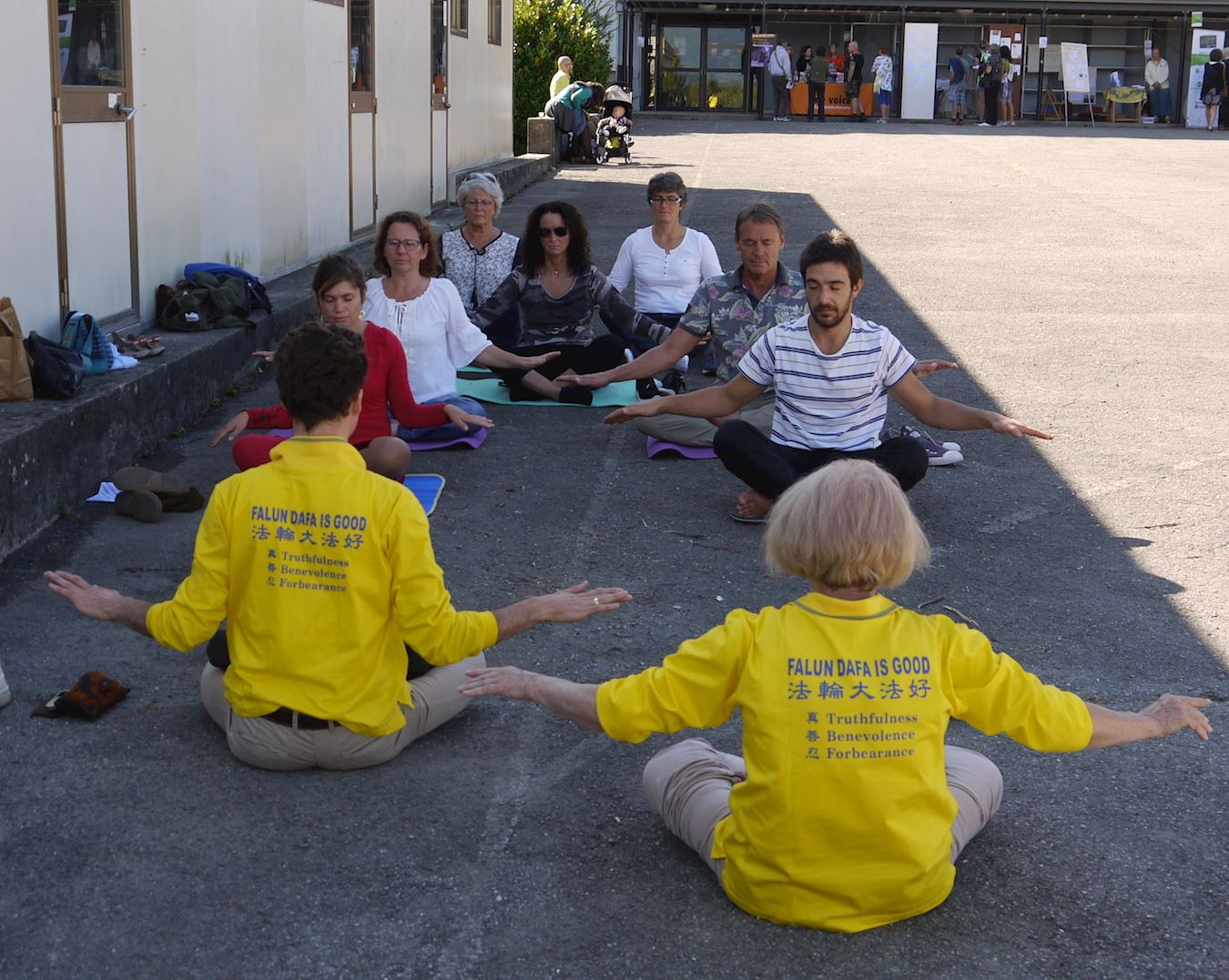 为期两天的展会,共进行了五次室内法轮功教功课程,每次近一小时,每次时间都不够用,后来应人们的要求,索性就在室外的操场接着教第五套功法。