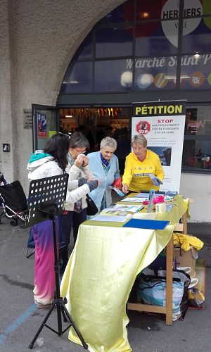 一位男士走近法轮功展位,认真看真相展板,他说知道法轮功,自己在家里炼,最近这一段时间炼功不勤奋,见到法轮功学员,想要严肃地重新开始。看到展板上的活摘器官信息,他又说:“我没有想到法轮功在中国被迫害到这种程度,我不知道法轮功学员遭受这些种类的酷刑甚至被活摘器官而死。谢谢你们来这里讲真相。”他与法轮功学员交换了通讯方式以便联络。