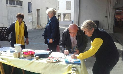 ![]() 图1~3:九月二十三日,法国西部法轮功学员在莱塞比耶市的一集市上进行了介绍法轮功和讲真相的活动。 |