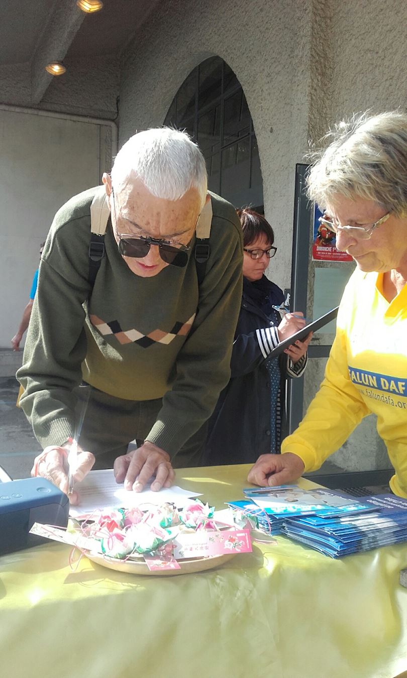 八十五岁的玛蒂尔德(Mathilde)听说在中国发生的迫害,不敢相信自己的耳朵,她立刻签字并表示:“我已经不年轻了,字也写不好,但是,我还是要练习写信,特别是写给我的议员,因为你们做的这件事很重要,我们有义务帮助这些受迫害的人。幸亏在我们国家不这样,人怎么能对他的同类如此的残酷?”