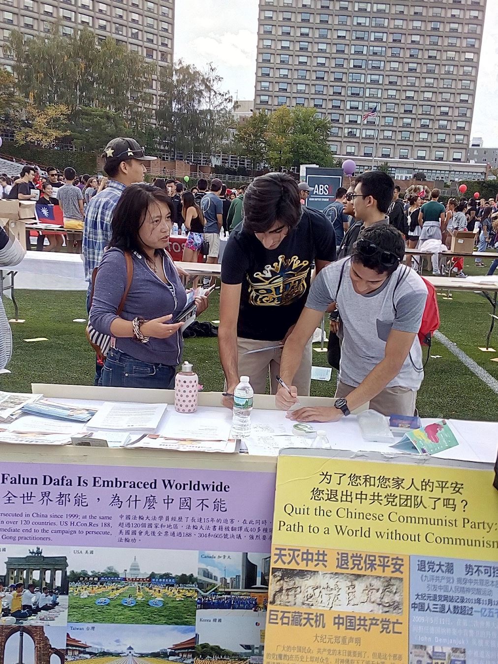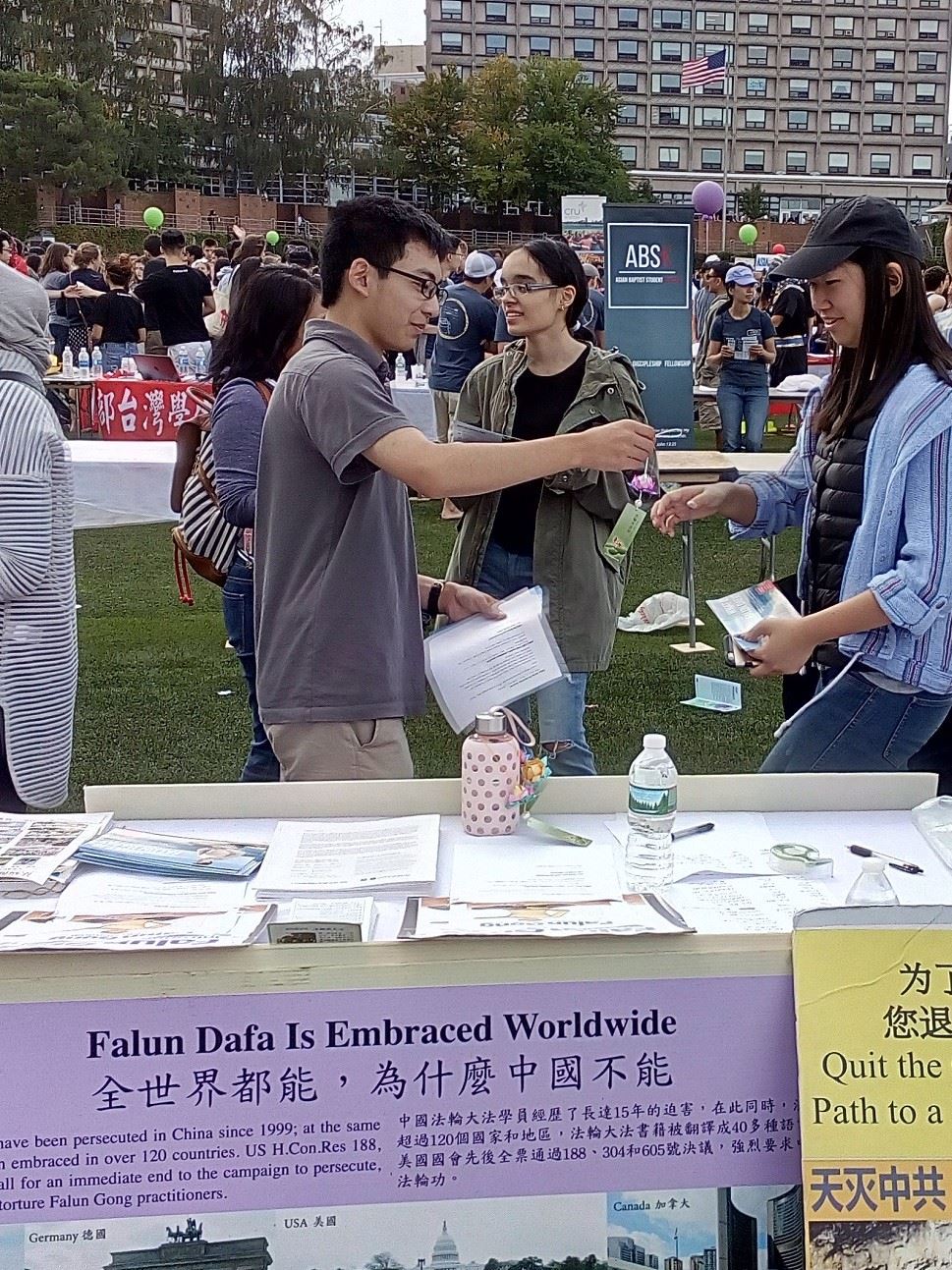 一位刚从中国大陆出来的学生,第一个来到摊位,他很惊讶:“法轮大法来波士顿大学了。”后来,他带了两个同学前来,并拿了资料。