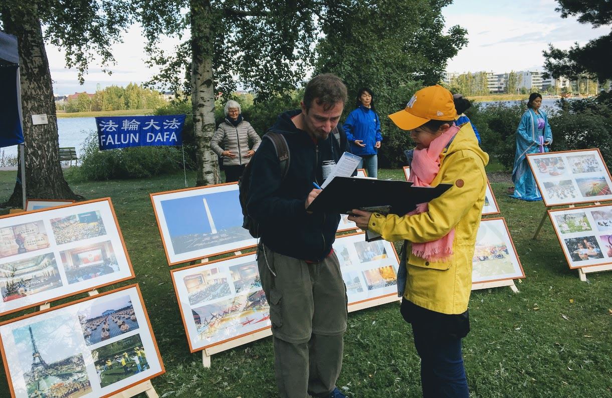 一位西方男性导游在明白真相后,每次都是先把游客领到横幅前讲解法轮功的真相后再做观光西贝柳斯的景点解说。还有明白真相的巴西导游Luisa,每次都把自己的游客队伍带领到法轮功展位旁边观看真相展板,并将中共活摘器官的情况一一解释给大家,她还拿真相资料去派发。