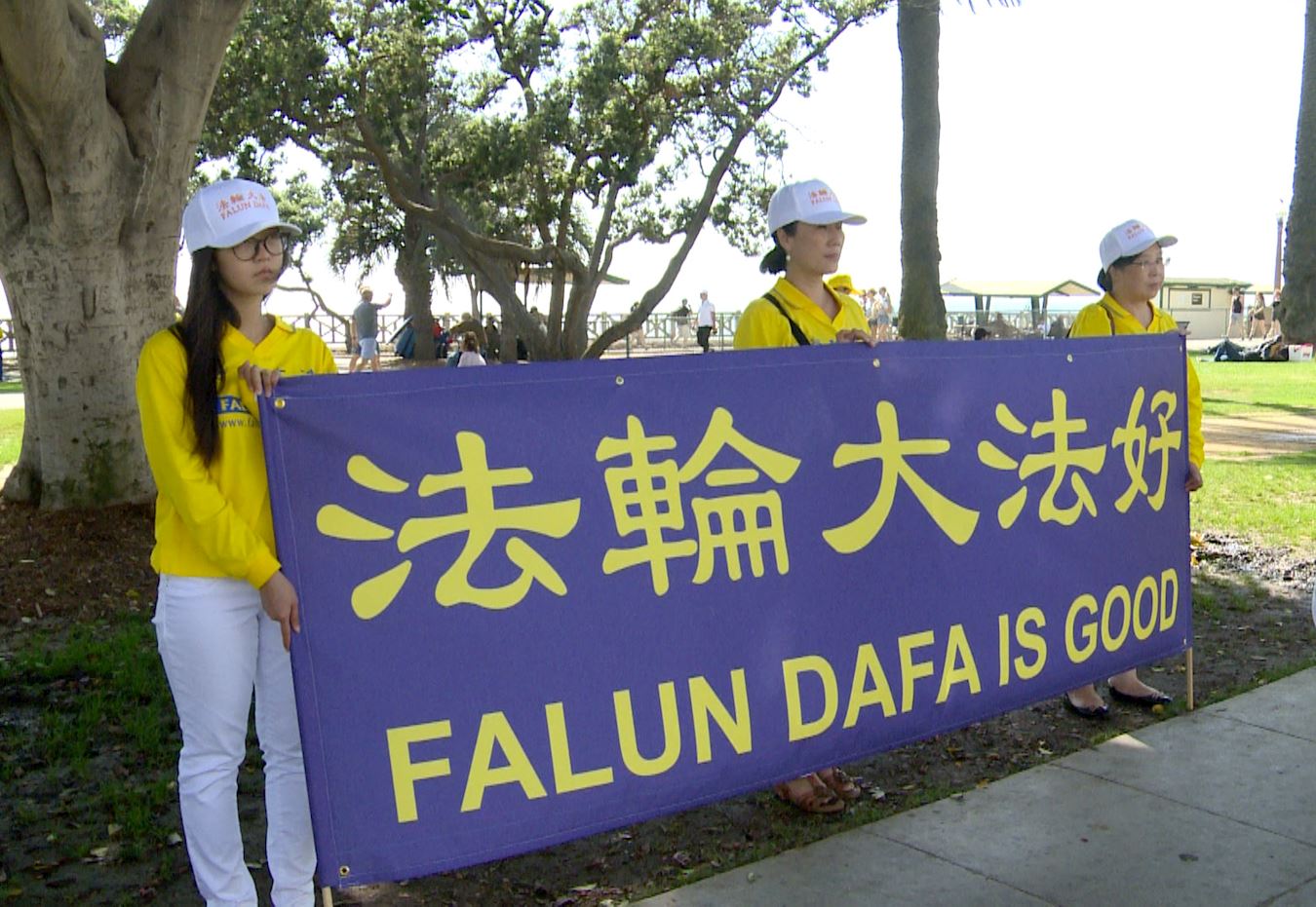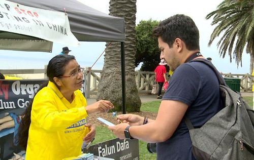 【明慧网二零一七年九月三日】美国南加州旅游胜地圣莫妮卡码头公园,因其临海居高的地形和适宜的气候,常年吸引本地和世界游客涌入、度假休闲。大洛杉矶地区法轮功学员因此经常到这里来讲真相,让人们了解法轮功的美好,揭露中共江泽民迫害法轮功、谎言欺骗世界所带来的危害。