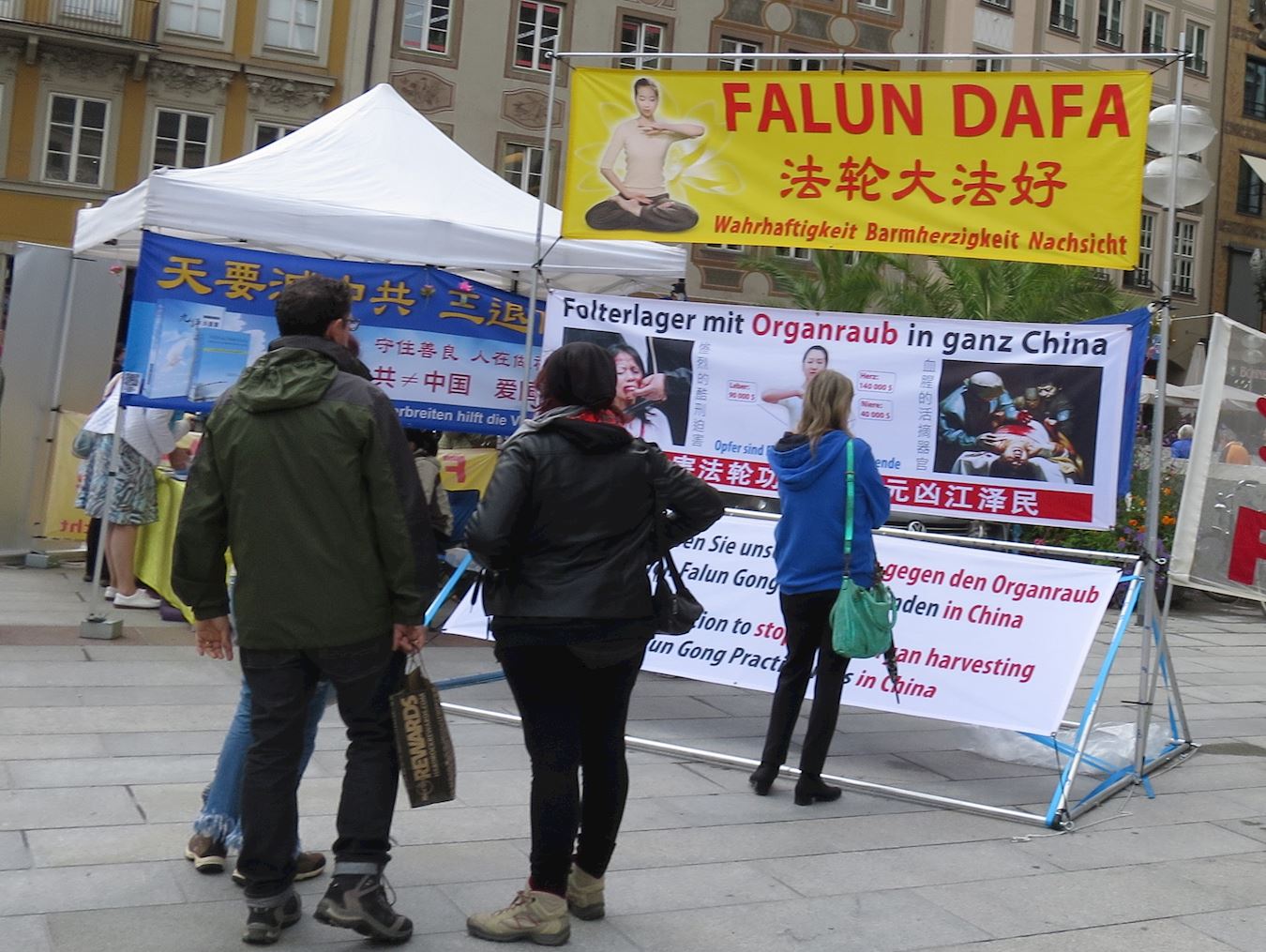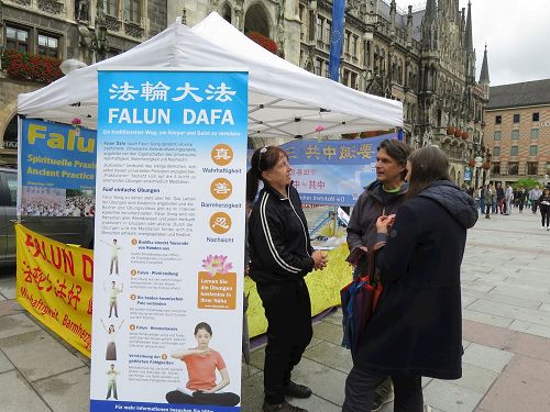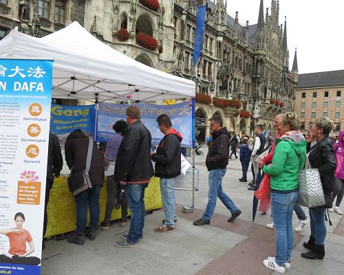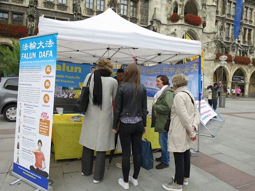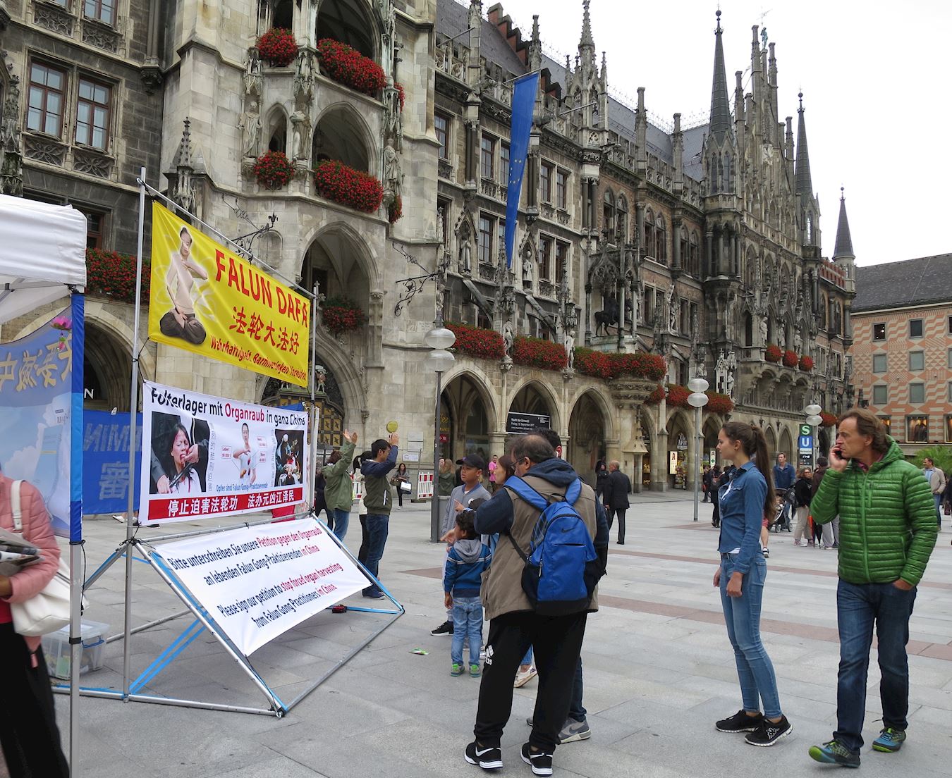 当天,来自德国巴伐利亚州的法轮功学员在市政厅大楼前举办活动,揭露中共迫害法轮功,并活体摘取法轮功学员的器官。广场上很多行人和各国游客,不少人驻足观看并和法轮功学员交谈,了解了真相的人们纷纷签名制止中共的罪行。