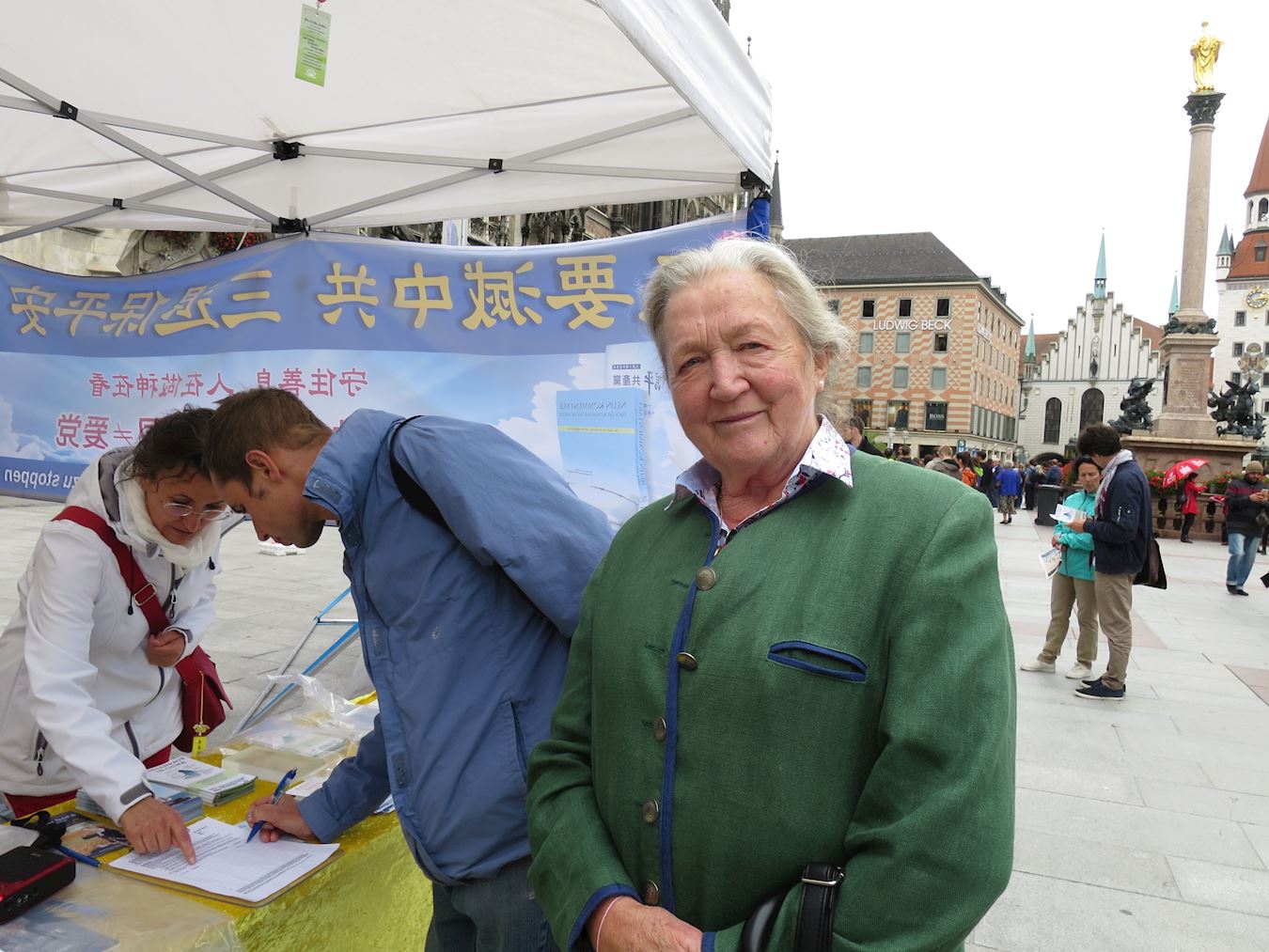 前面提到的Petra Angerl女士退休前经营家族连锁服装店,专门出售传统巴伐利亚民族服装。她认为中共迫害法轮功的行为太恐怖了。她认为通过征集签名的方式是有效的,如果人们都能够相互帮助的话,像她在战后所经历的那样,就能共同渡过难关。