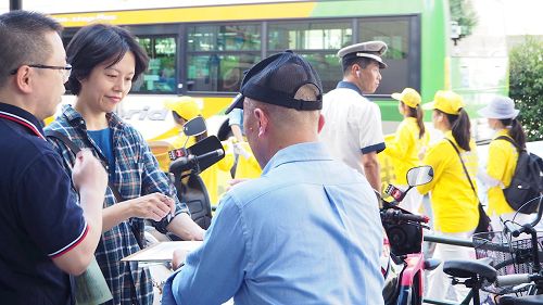 一位住在日本的华人女士说:“我支持你们!”日本法轮功学员在华人学员的协助下,和她讲了真相,这位女士明白了真相退出了中共少先队。