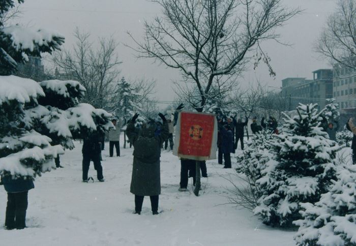![]() 图1:即使在冬天最冷的日子里也坚持室外炼功(一九九六年拍摄) |