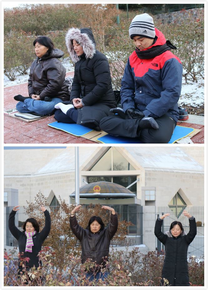 十二月三十日下午,几位华府法轮功学员在中共驻美大使馆前炼功,要求释放在中国大陆仍被非法关押的法轮功学员。