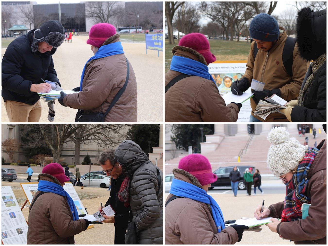 赵丽蓉女士手里的征签板上布满了签名,有的来自美国其它州,也有外国游客。赵女士说,这么冷的天,很多明白了真相的善良游客都停下来,签名呼吁制止中共迫害法轮功学员的暴行。