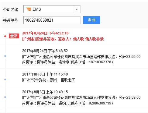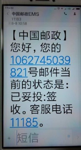 ![]() 七月二十七日收到的妥投信息 | ![]() 八月八日收到的妥投信息 |