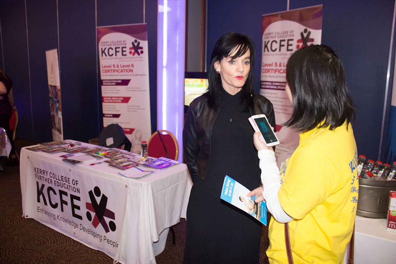 '图4:一月十四日,爱尔兰西南部基拉尼的“平衡健康展”上,唐纳·沃什生活基金会总裁,凯里教育学院(KCFE)校长的卢西女士邀请法轮功学员前去教育学院教功。'