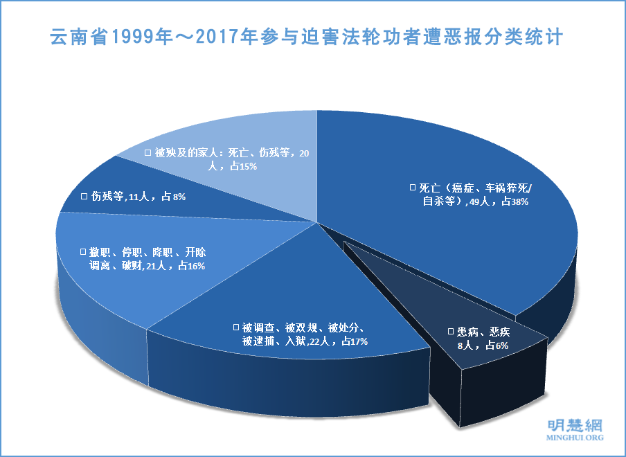 根据1999年7月至2017年12月在明慧网曝光的云南省参与迫害法轮功的人员遭恶报的案例,云南省至少131人遭恶报,恶报形式以死亡为最多,共计死亡49人,其中“610”主任死亡5人;其中公安系统遭恶报人数最多共33人;参与迫害法轮功者有的命归黄泉、家破人亡,有的获重刑入狱,殃及家人,有的病魔缠身、生不如死……他们也都是这场迫害的受害者。