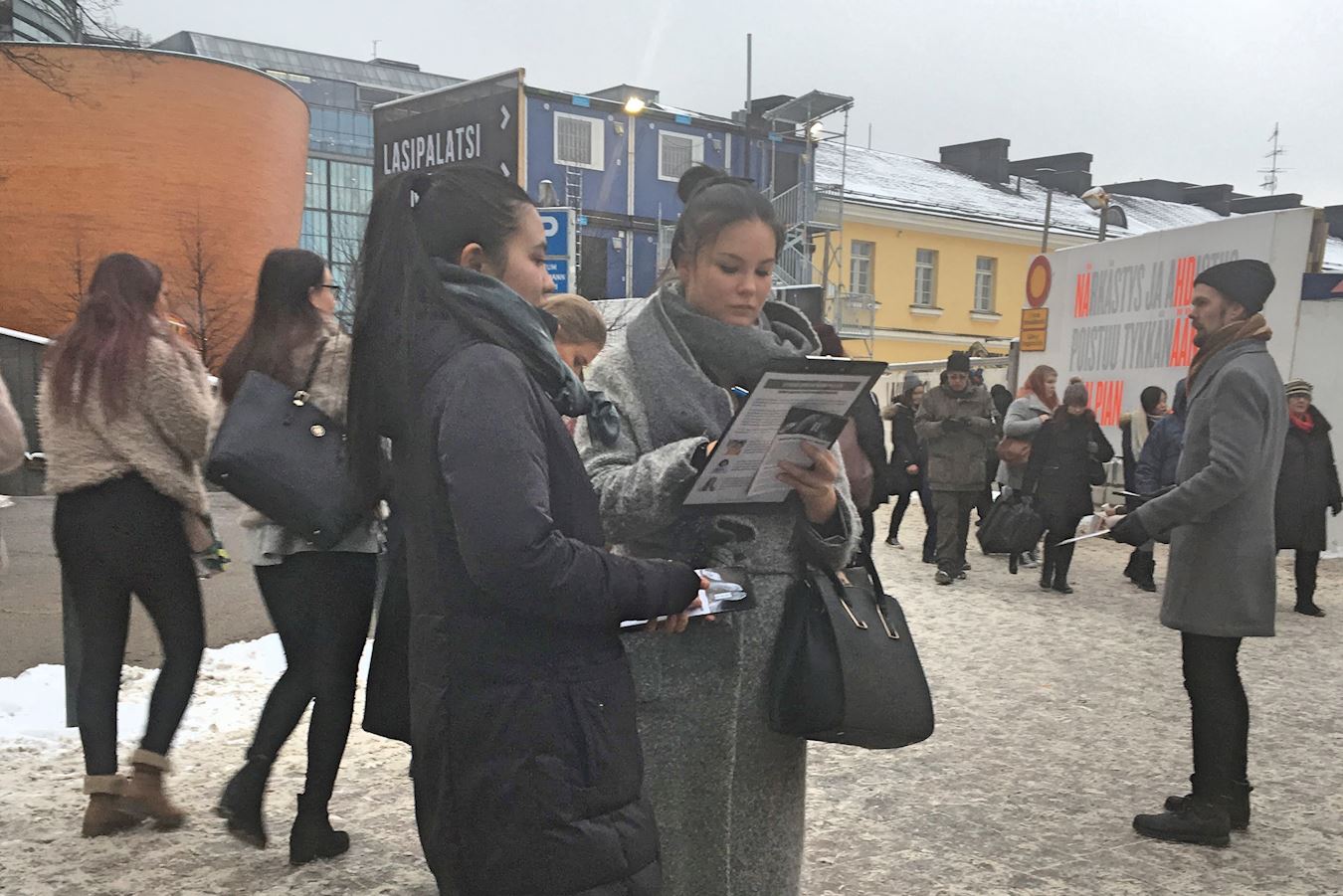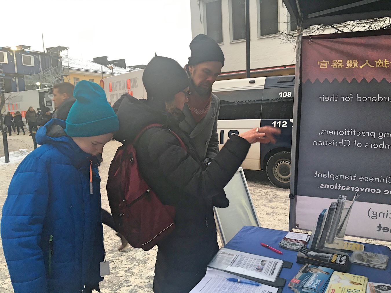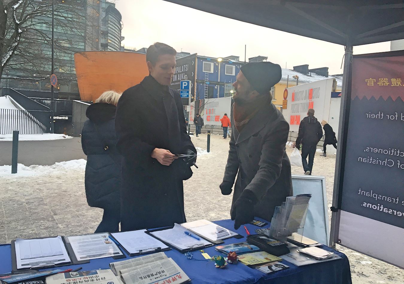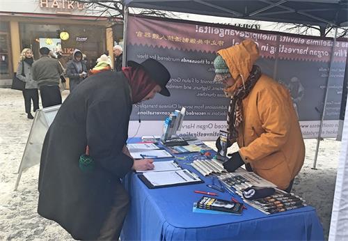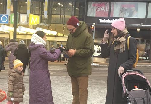 一位年轻男士经过真相点,驻足与学员安迪(Antti)攀谈。他告诉安迪,自己之前也听说过迫害,他表示,自己之前已经在征签表上签过名了。他与学员安迪聊了很长时间。当安迪告诉他炼功信息时,他觉得大法的“真、善、忍”非常珍贵,这就是他最需要的。