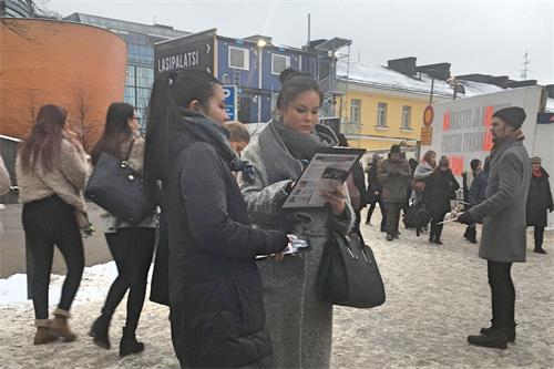 一对芬兰母女看了法轮功学员的功法演示后,主动走到上前向学员了解真相。学员给了她们炼功地点和真相资料后,她们很高兴地离开了。
