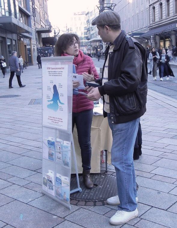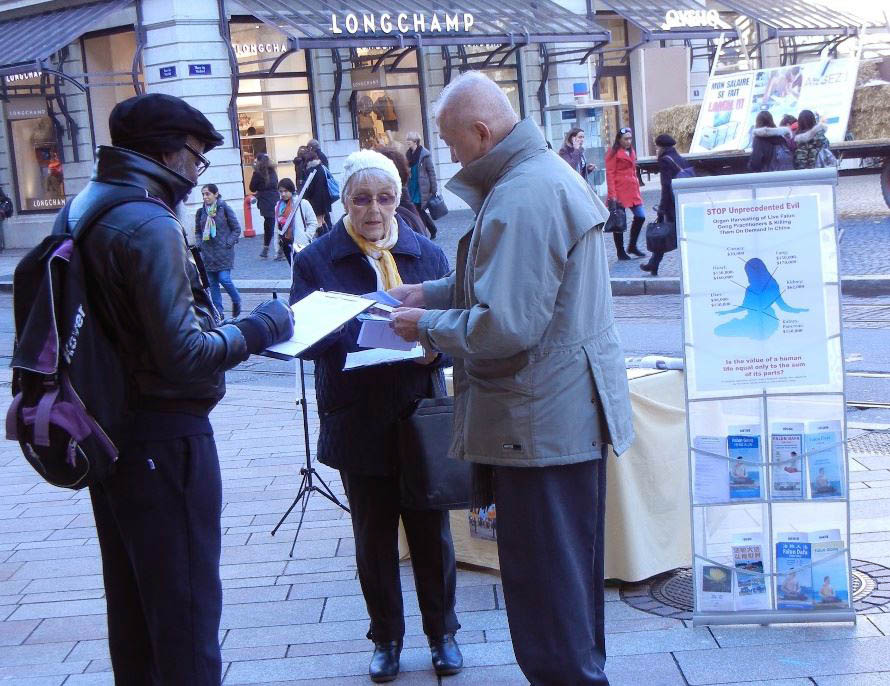 有两个年轻的女士非常关心强摘人体器官一事。在听了解释后认识到问题的严重性,感到非常震惊,立即在签名表上签字。其中一名女士说:她感到这件事与她有关系,因为她八个月的女儿也可能要做器官移植。她还说要留心别被中国推销人体器官的广告欺骗,为了找器官而花钱造成他人无辜被杀。
