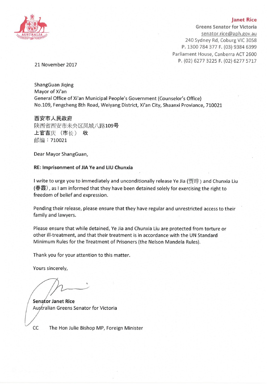 ![]() 澳洲国会参议员莱斯(Janet Rice) | ![]() 澳洲国会参议员莱斯(Janet Rice)致信西安市市长上官吉庆,要求他立即无条件释放两名法轮功修炼者。 |