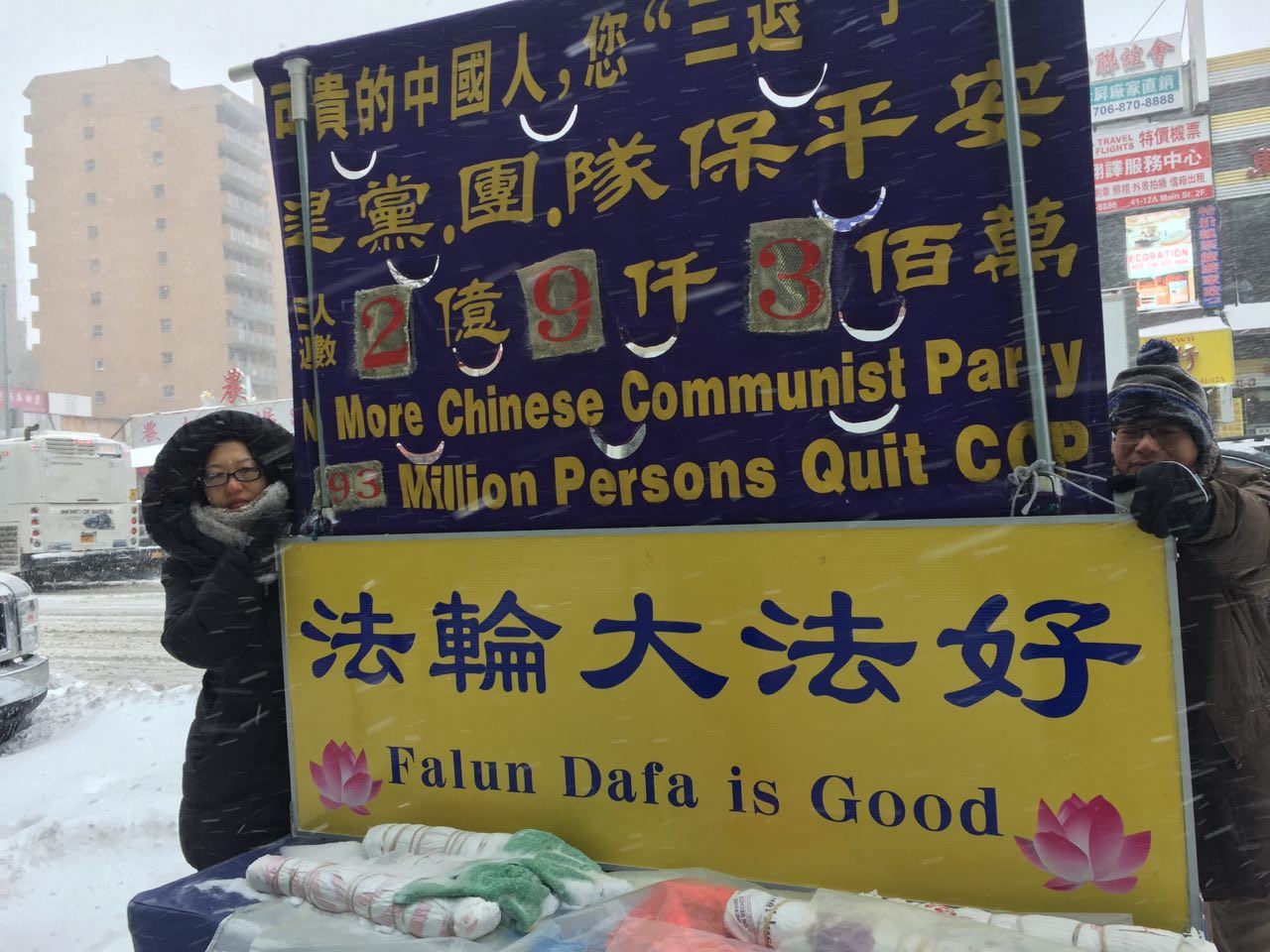 平时熙熙攘攘的华人社区法拉盛,笼罩在白色的苍茫中,但当天依然有不少要上班的华人顶风冒雪出门,各大中国超市都正常开。五十岁的法轮功学员孙同,早上九点多就象平时一样,在图书馆前冒着风雪架起真相点的桌子和“法轮大法好”“三:退.人数2亿9千3百万”的条幅。当天,总部位于法拉盛的“全球.退:党!服务中心”,近二十名法轮功学员从早上十点到下午四点轮流坚守着图书馆前的真相点,有的学员负责固定条幅,不让风吹倒;有的学员负责发资料、放真相广播。这个真相点在图书馆前已经摆设了超过十几年,法拉盛的华人无人不知。