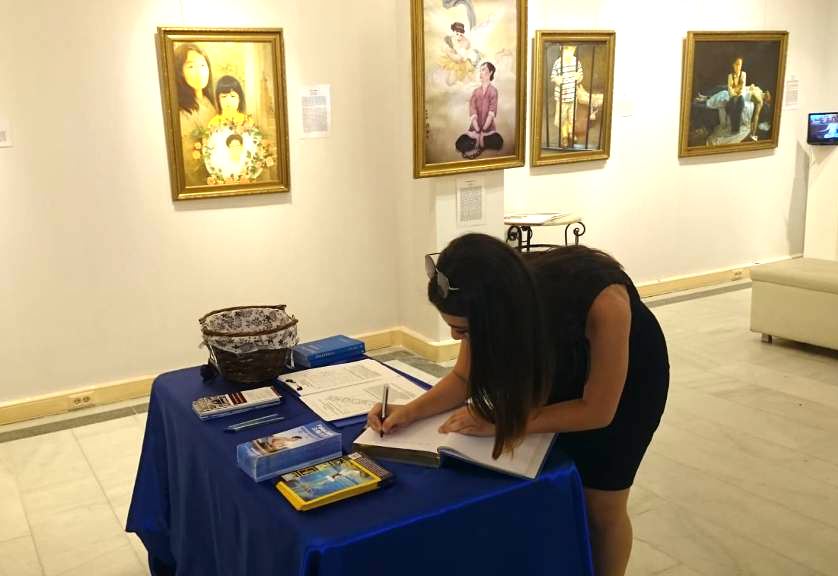 Saadet女士在留言簿上写道:我的心灵感受到了发生在中国的迫害的残酷。我希望那些参与迫害的人能够心中有善,能够宽容。观看画作时,我的心在痛。我谴责中共的暴行。