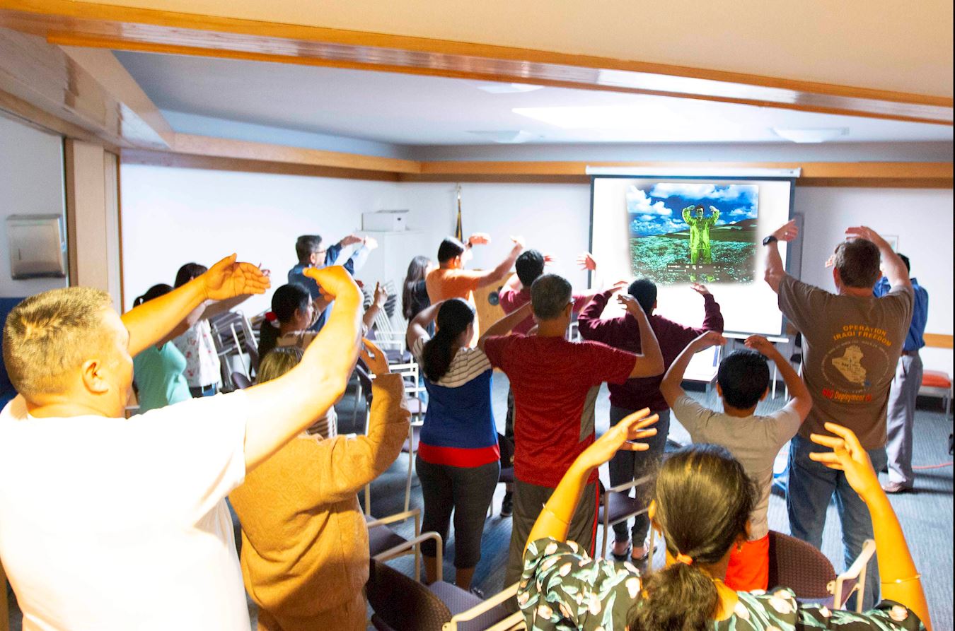 这是法轮功学员在佛利蒙和联合市举办的第七期法轮功教功班。明显的健身效果,令人们口耳相传,因此前来学炼的人越来越多。当天的教功开始后,不断有人进来学,共有三十多人参加了教功班。大家按照屏幕上的教功视频认真地学着法轮功的五套功法动作。