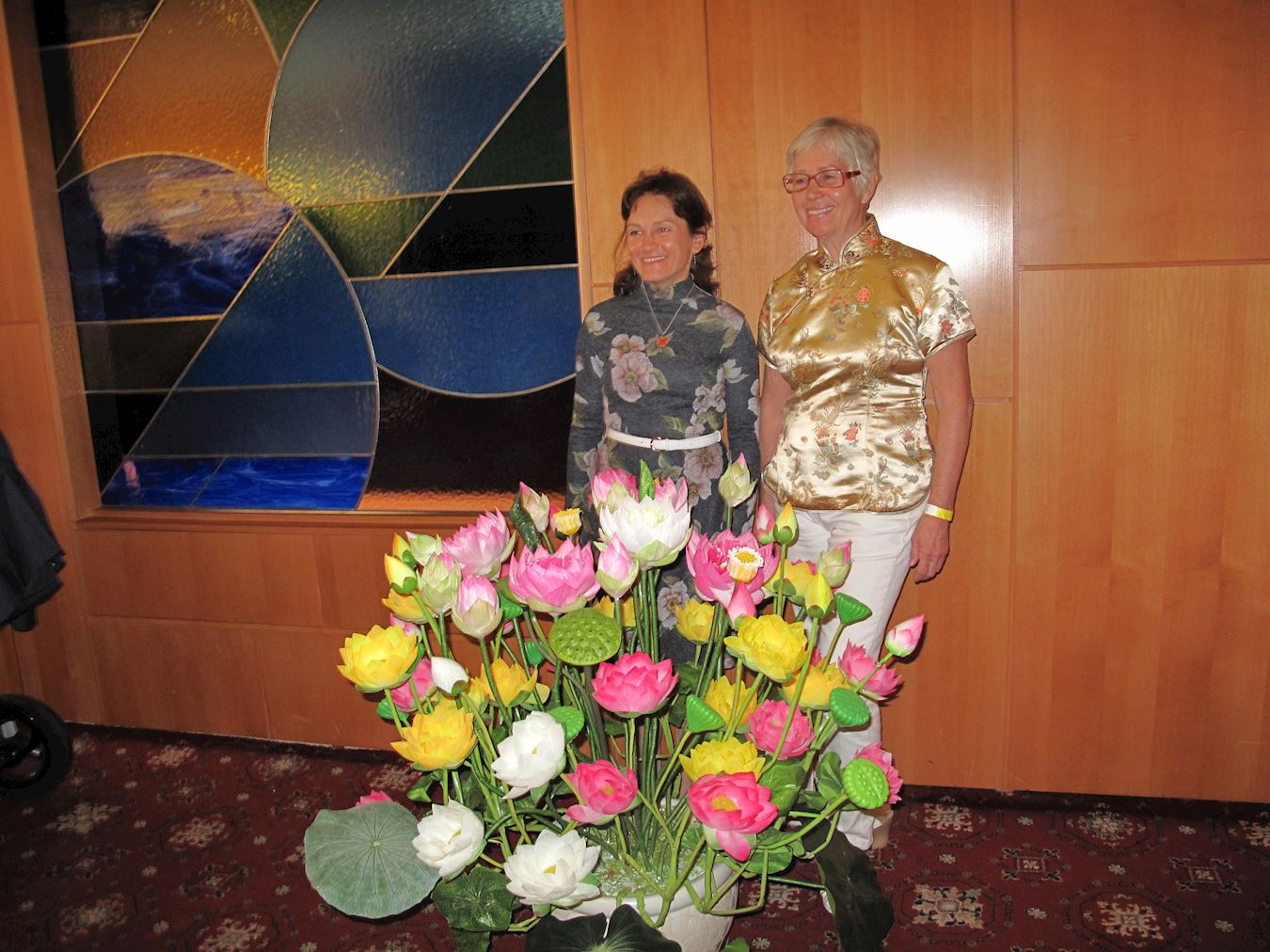 七十一岁的乌克兰女士亚历山德拉(Alexandra)喜爱中华传统文化,此次,她身穿中式服装前来参加法会。亚历山德拉在二十一年前开始修炼法轮功,和她一起在莲花丛前留影的亚瑞丽娜修炼法轮功十五年了,两位乌克兰女士会一点中文,当亚历山德拉被问到修炼法轮大法如何受益了,她笑着一边用手从低向高比划着(表示“提高”),一边说出两个中文字“心性”,表示修炼法轮大法让她提高了心性。虽然已经七十一岁,但看上去比实际年龄要年轻很多,她笑着说:“因为法轮大法好,只是因为法轮大法好!”