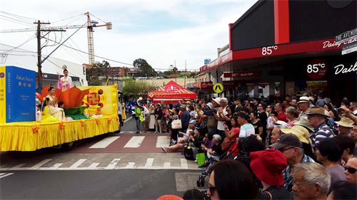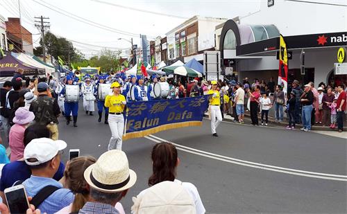 由天国乐团、腰鼓队和“法轮大法好”功法演示花车组成的法轮功学员游行队伍被观众誉为最美丽和最长的队伍。所到之处,给观众带来惊喜,人们纷纷报以欢呼及热烈的掌声。队伍行进到主席台前,主席台上的嘉宾也向法轮功学员们频频挥手致意。